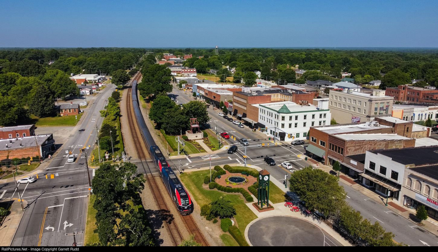 A late Amtrak 20 charges north through the popular Nc rail fanning town of Thomasville. Thomasville is also home to the Big Chair which you can see #20 passing.