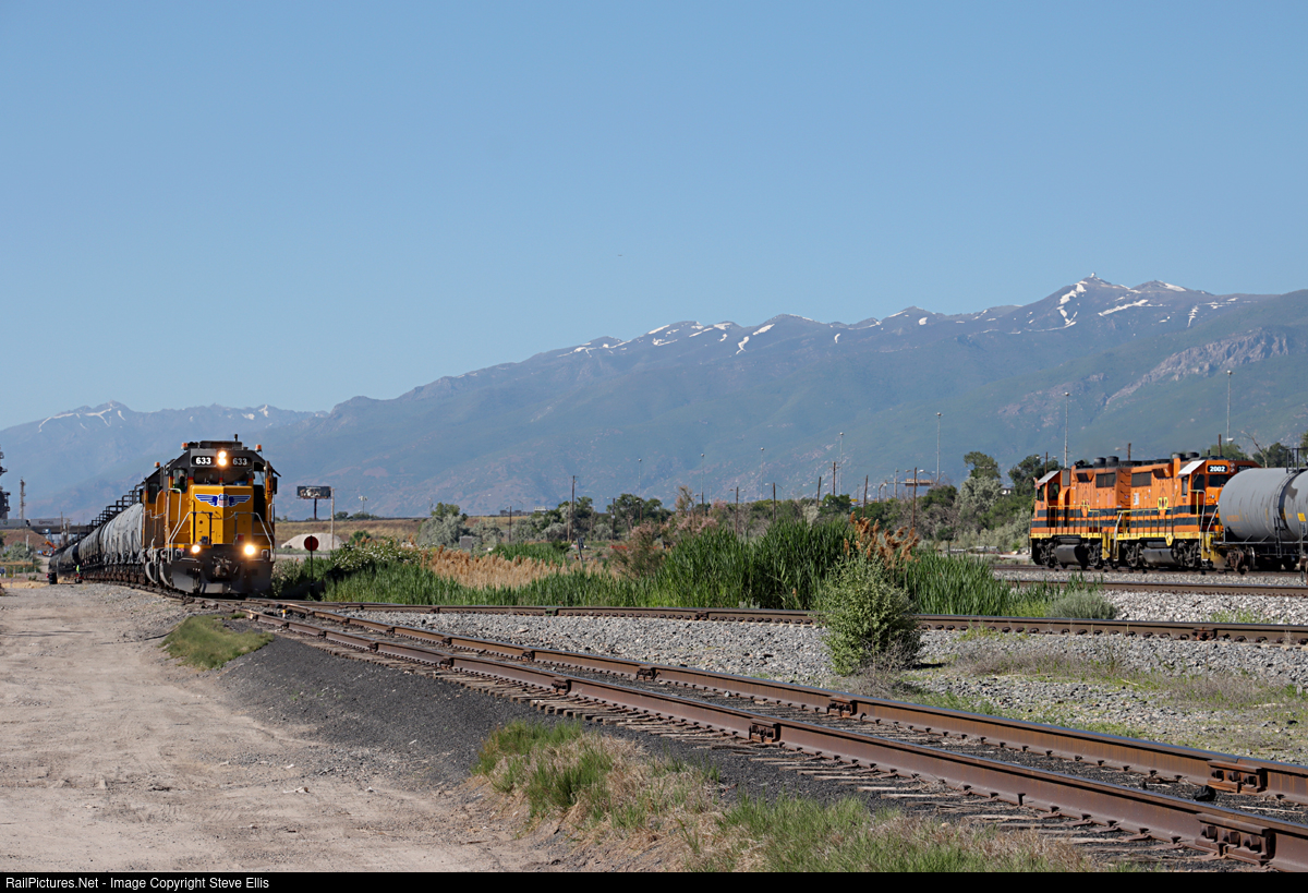 | The Utah Railway RUT312 local, passes the Union Pacific Chevron local at Becks, Utah. |