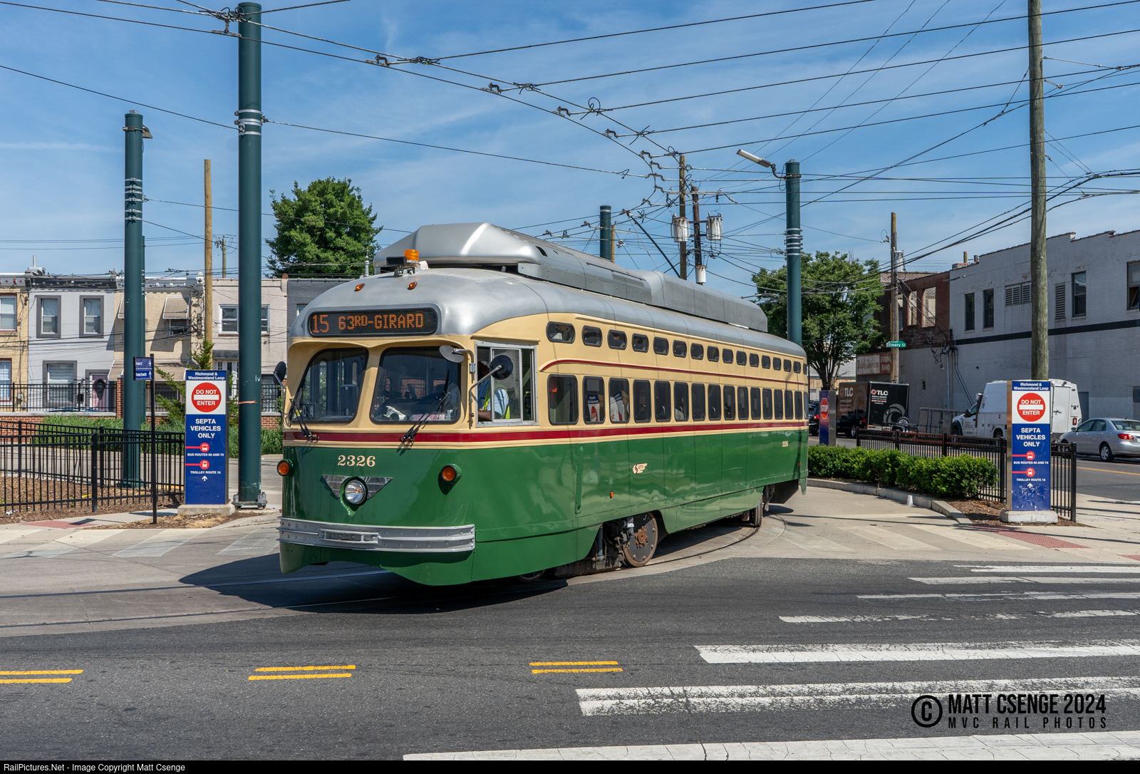 On the first day of revenue service in 12 years, Southeastern Pennsylvania Transportation Authority (SEPTA) PCC III no. 2326 is seen departing the Richmond & Westmoreland Loop, heading west towards Girard Ave. Though trolley service on the entire Route 15 was suspended in 2020, service east of Girard and Frankford was suspended in 2012 due to construction work on I-95. |