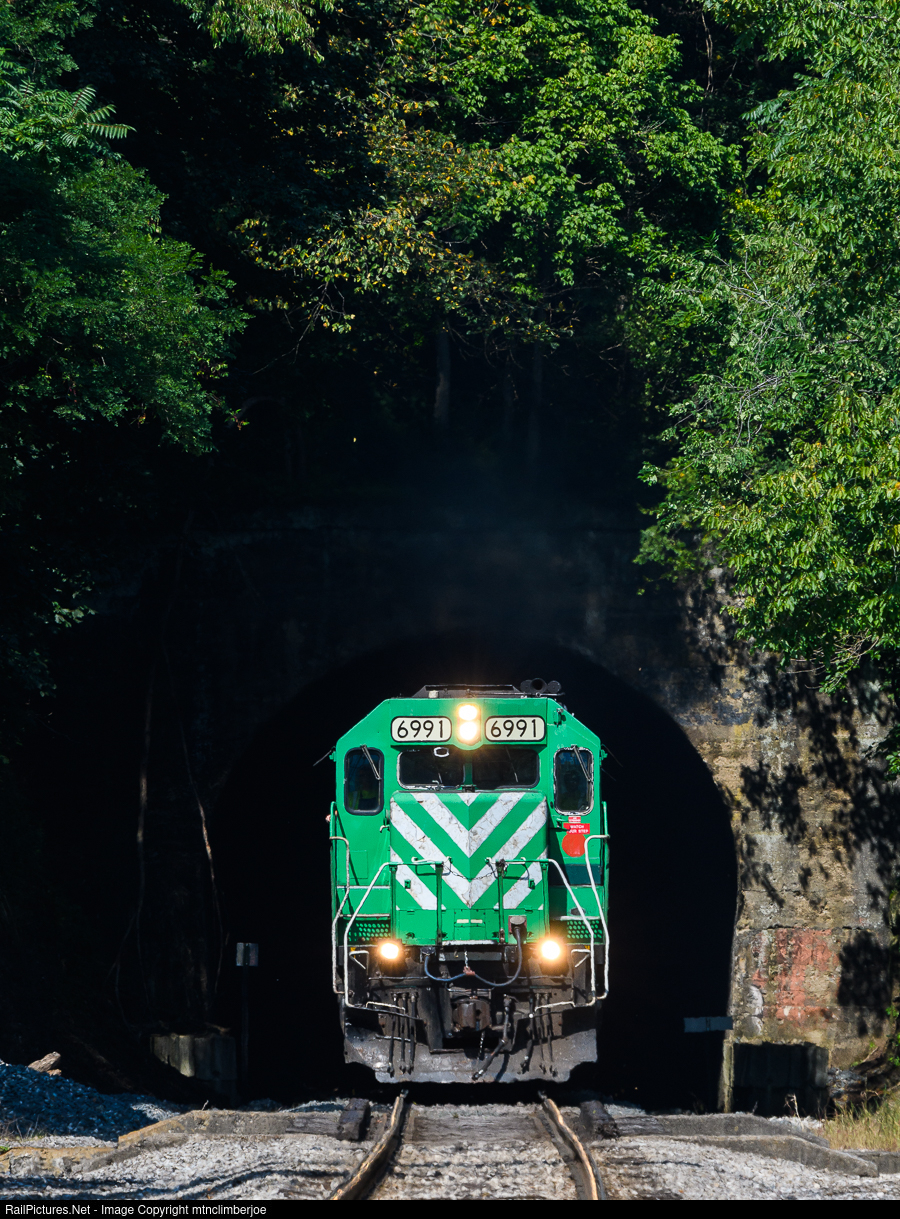 | A trio of SD40's lead Wheeling & Lake Erie train 218 as it emerges from the Stateline Tunnel, crossing from West Virginia into Jefferson, Pennsylvania. The train would stop in Avella to service a customer before proceeding east to Rook Yard. |