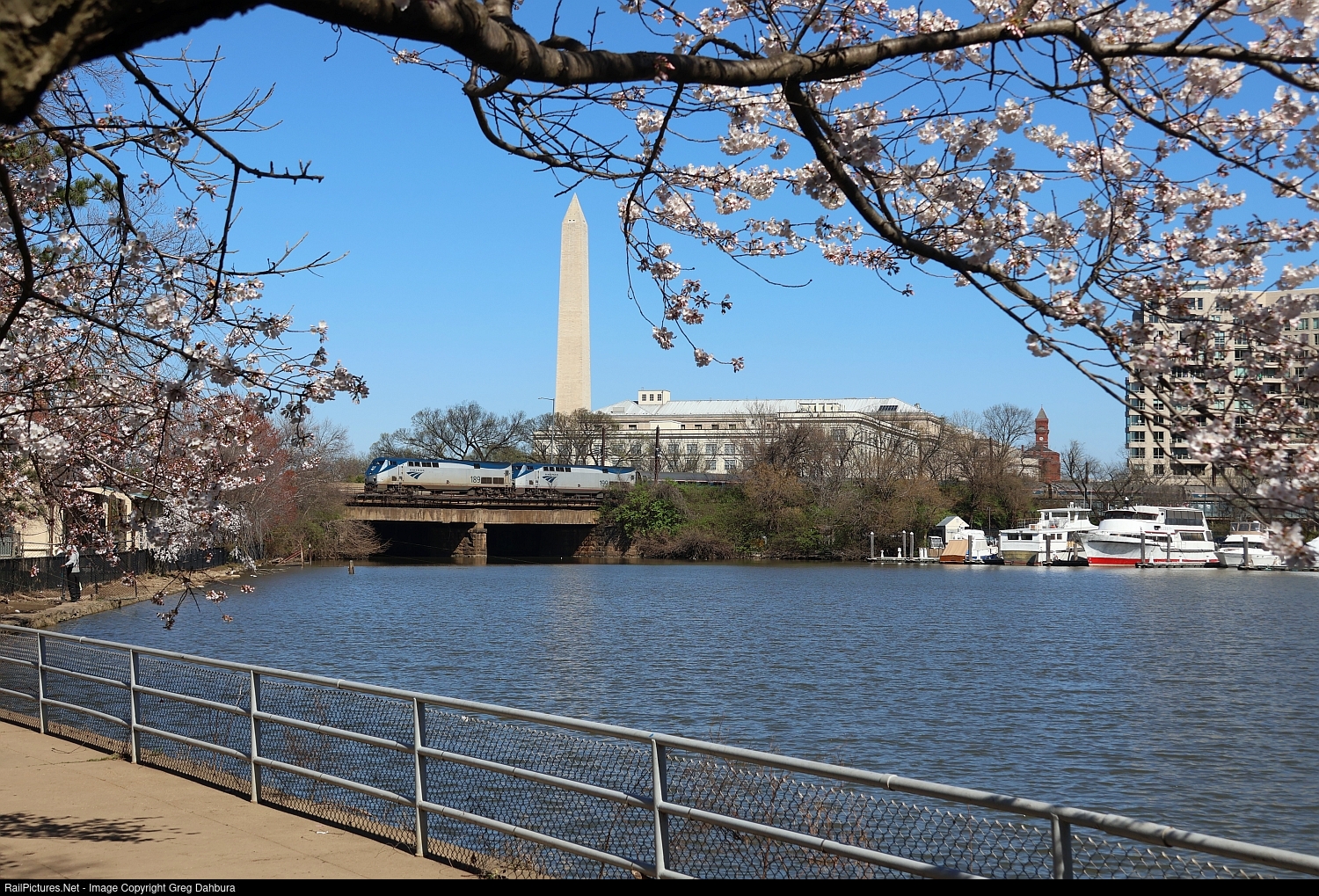 | A southbound Amtrak train heads over the channel that connects the "Tidal Basin" to the Potomac River with cherry blossoms starting to pop. |