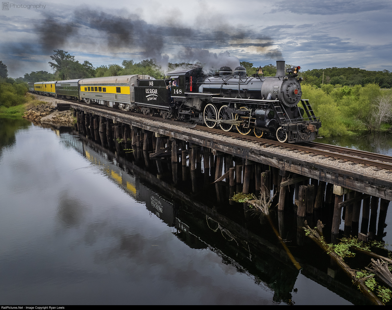 | Built in 1920 for the Florida East Coast Railway by the American Locomotive Company, US Sugar no. 148 is seen crossing over Fisheating Creek on a warm Summer afternoon on the return trip to Clewison, from Lake Placid. |