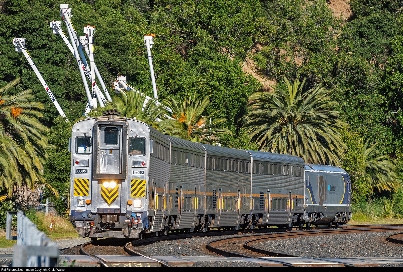 A bunch of stored bucket trucks (commonly called "cherry pickers") replicate how brontosauruses must've looked, or perhaps a flock of cranes (the birds, not the work equipment), as Amtrak Capitol Corridor train 720 rounds the curve at the western end of the station in Martinez, on Union Pacific's Martinez Sub. Just east of the station, this train will cross the Suisun Bridge across the Carquinez Strait, as it heads east from Oakland to California's capital, Sacramento. The other Amtrak corridor trains that operate through here, the San Joaquins, diverge onto BNSF Railway's Stockton Sub east of here to head south down the San Joaquin Valley to Bakersfield. Toss in a pair of Amtrak long-distance trains (California Zephyr and Coast Starlight) and Union Pacific freights and one can easily see why so many railfans come here to photograph trains! (Martinez, California – June 16, 2024)