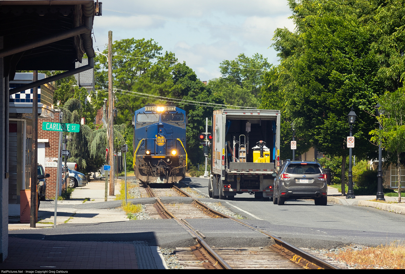 | This delivery driver maybe did not find the best place to park for him to unload food for a local diner. Thankfully L137 was moving slow enough and he was able to get the hint and reposition his truck quickly. Note the all- NS consist with the "Norfolk and Western" heritage unit leading. |
