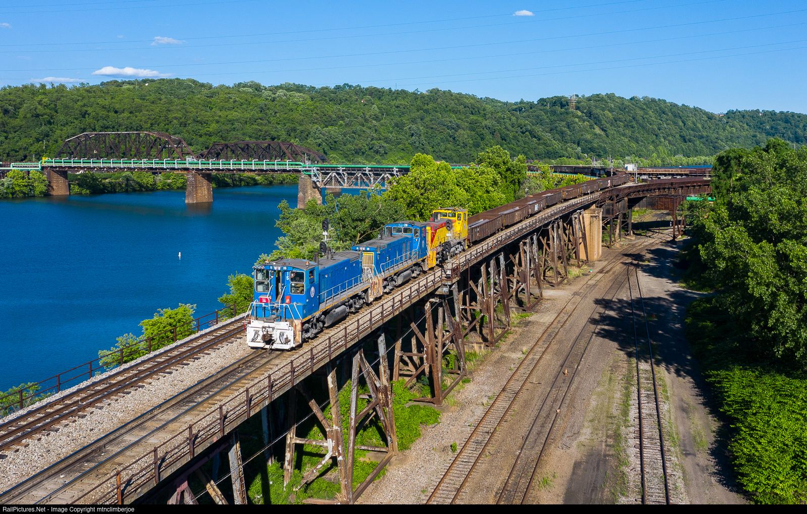 | With a train of gons loaded with steel slabs from the US Steel Edgar Thompson Works, a trio of MP15's on the Union Railroad's Job 76B cross the bridge over the Monongahela River and have turned on to the Munhall Branch. The train is descending on a long trestle to reach the yard where they will drop these cars for interchange with Norfolk Southern. |