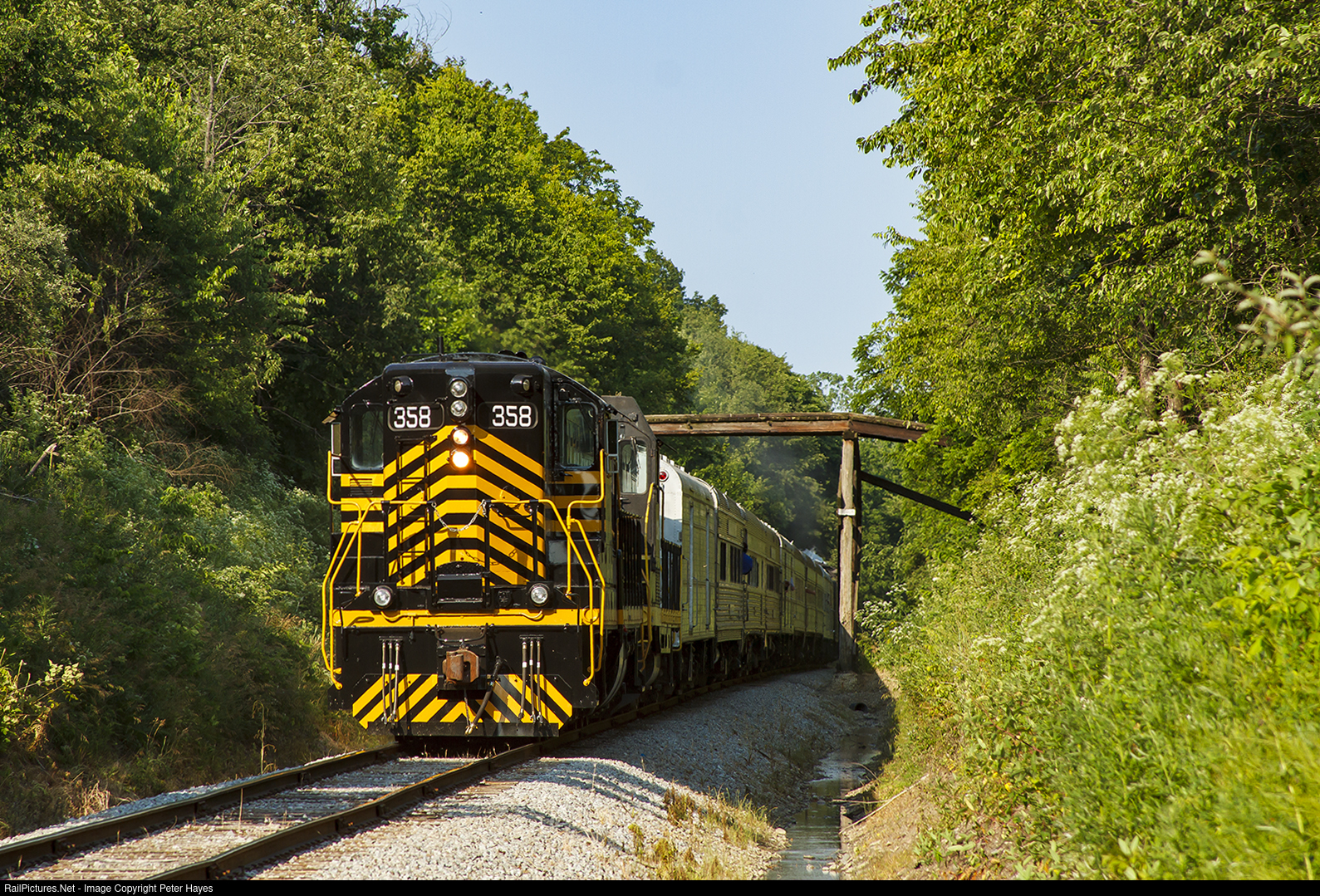 Nearly back to Edon, OH, where the run started, gorgeous, freshly-restored NKP 358 brings up the rear passing under an old wooden bridge used as a farm road in years past.