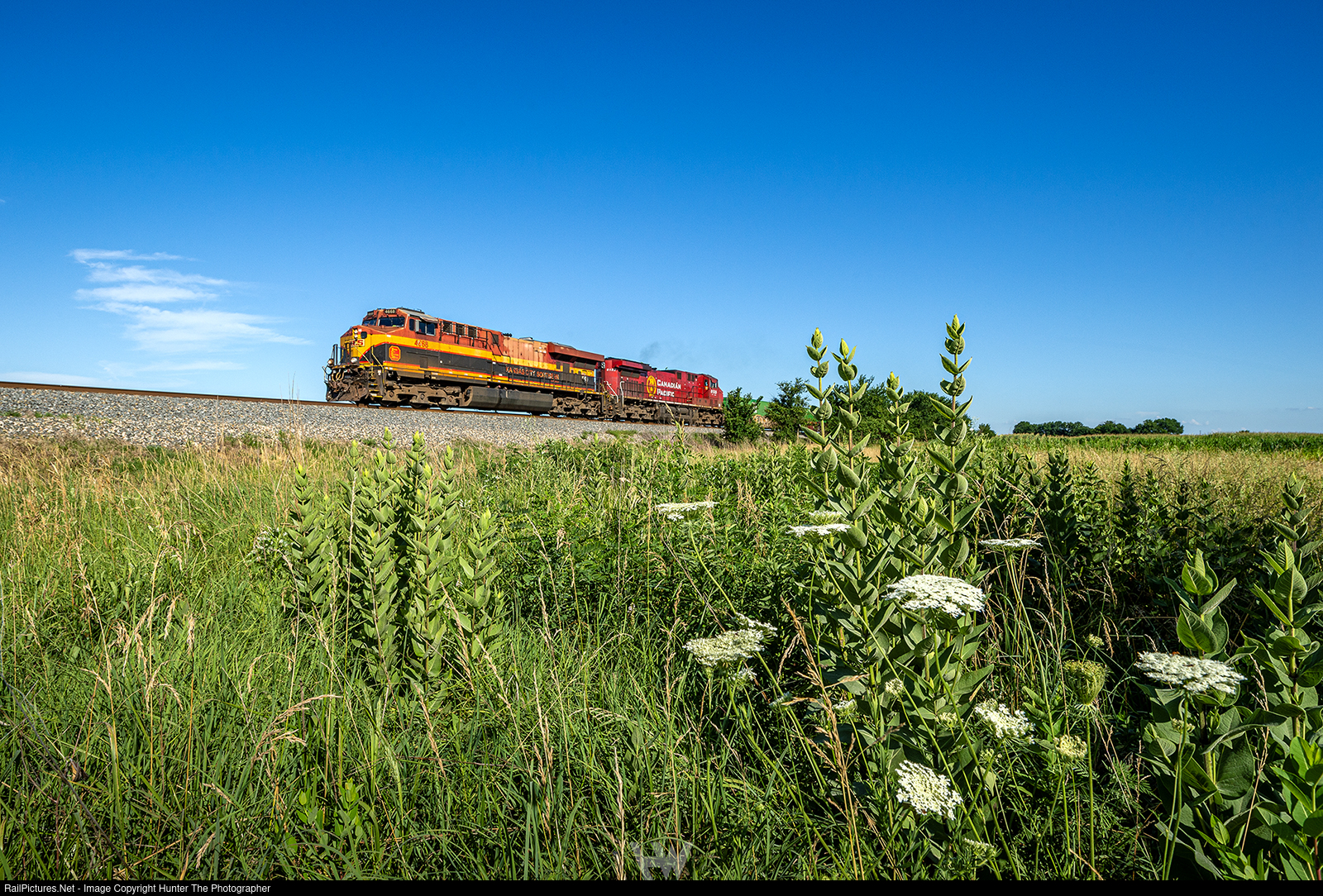 | In the bright sunlight of a hot and humid Sunday, June 23, 2024 afternoon, northbound intermodal train I181 cruises past corn fields near Asbury, MO.