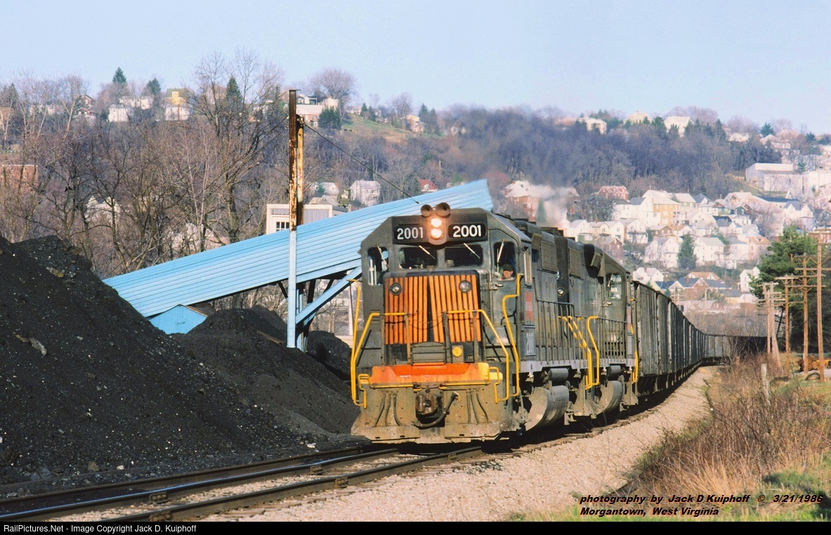 | MGA, Monongahela Railway GP38's 2001- 2003 has a northbound loaded coal train at, Morgantown, West Virginia. March 21, 1986. Jack D Kuiphoff © photo |