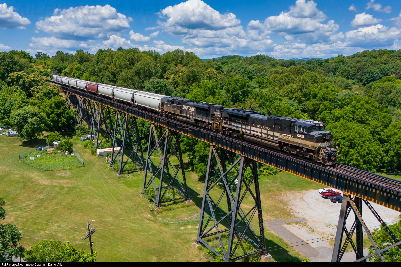 | The Savannah and Atlanta heritage unit is in charge of northbound manifest NS 12Z as it thunders over the trestle in Troutville, VA along the Roanoke District. |
