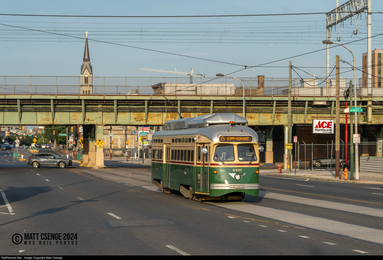 Southeastern Pennsylvania Transportation Authority (SEPTA) PCC-III no. 2337 is seen on Girard Ave just after crossing under the tracks of the former Reading Co., now SEPTA Regional Rail.
