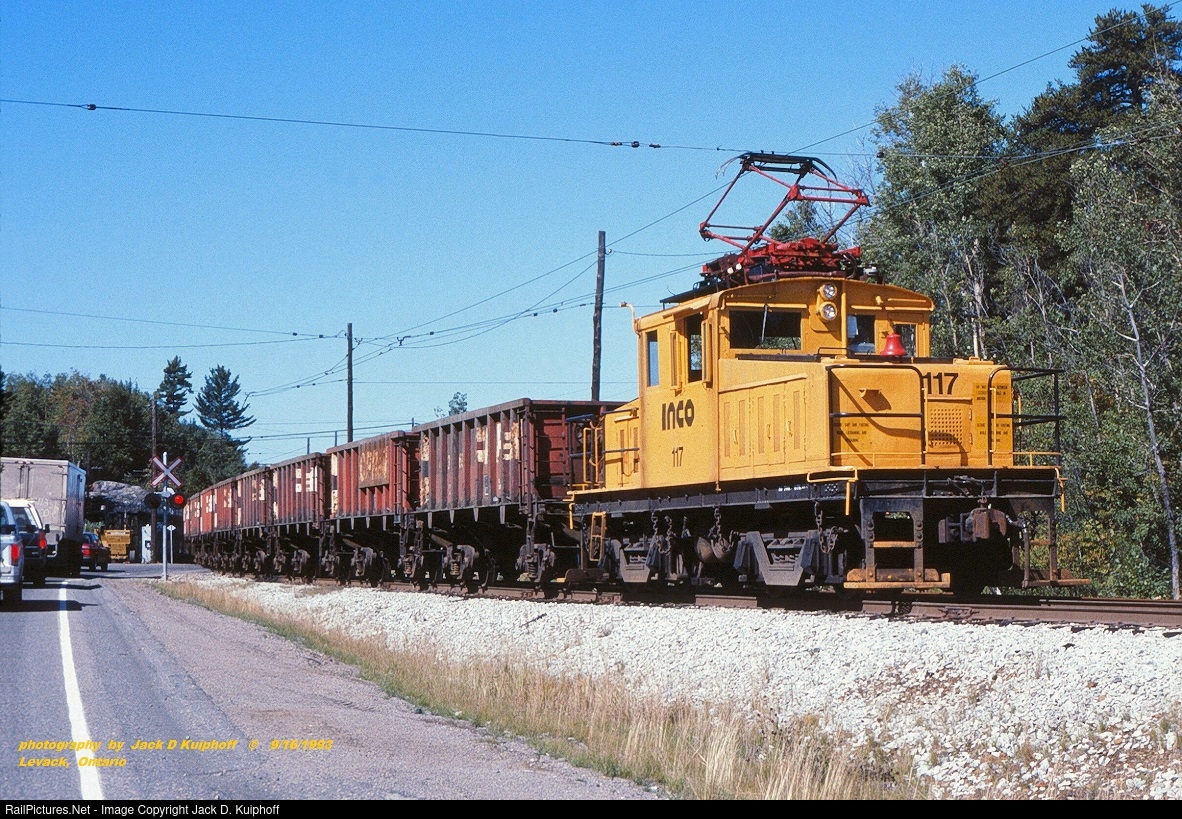 | INCO electric 117, is coming back from the CP interchange with a string of empty CP jenny's, and heading back down the hill to the Nickle mine in the town of Levack, Ontario. September 16, 1993. Jack D Kuiphoff photo ©