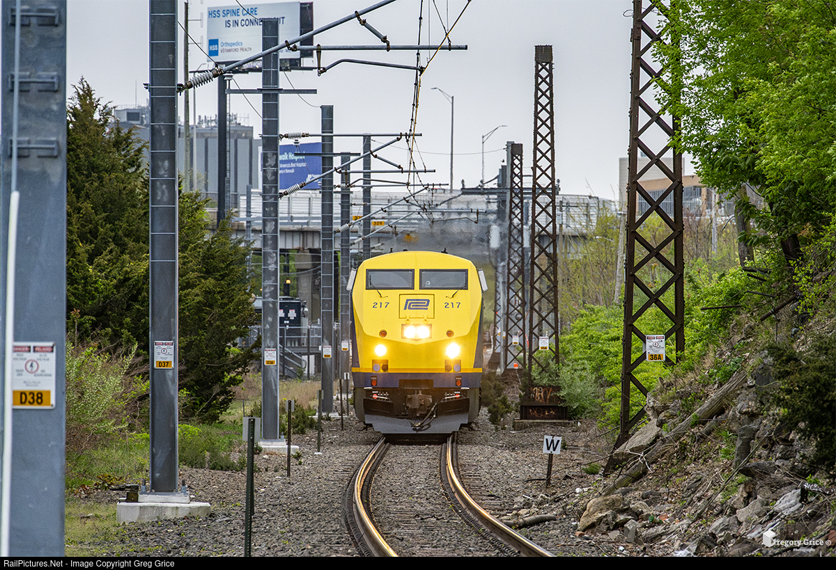 On a rainy April 30th, 2024, Metro-North Train 1860, with the 40th Anniversary "Penn Central" heritage-wrapped P32AC-DM, MNCW 217 leading, approaches the end of electrification on the Danbury Branch at Jennings Place (MP 0.9) in Norwalk, Connecticut. New wire was strung on the branch in 2023 for the DOCK Yard/ WALK Bridge project, but the old catenary poles still remain on this three tenths of a mile stretch.