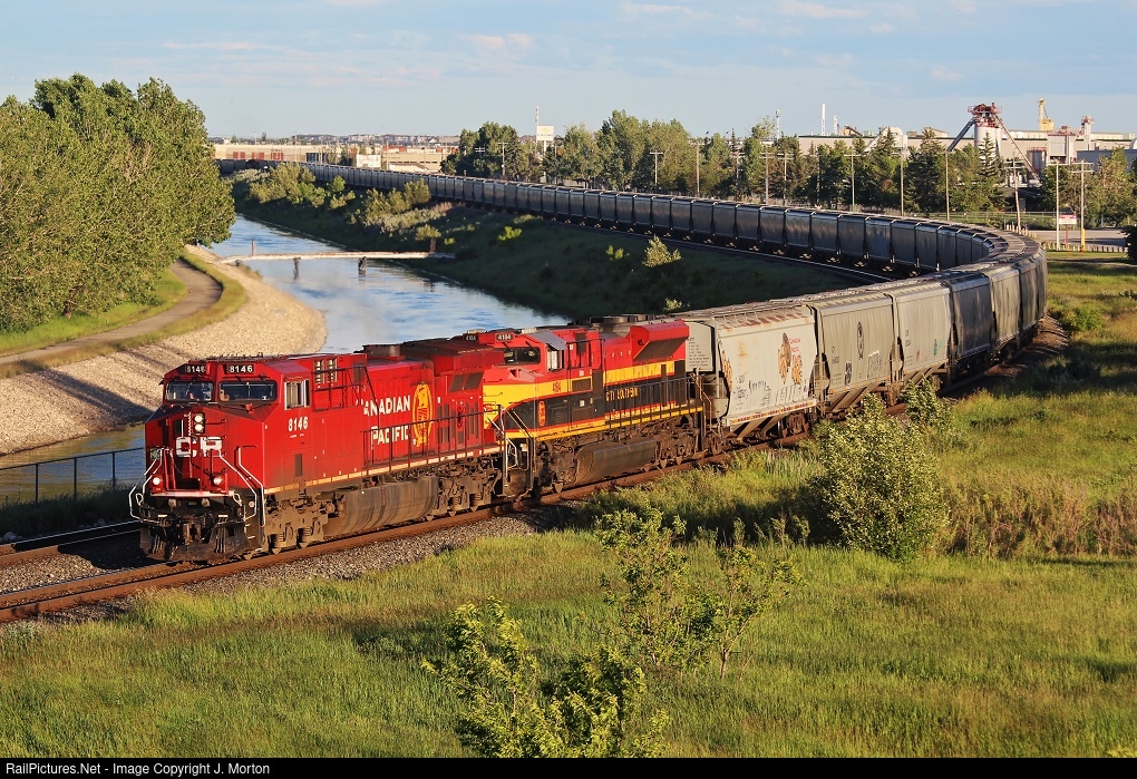 CP 8146 leads a 145 car grain train west at Glenmore. The evening light is quite nice here in the summer.