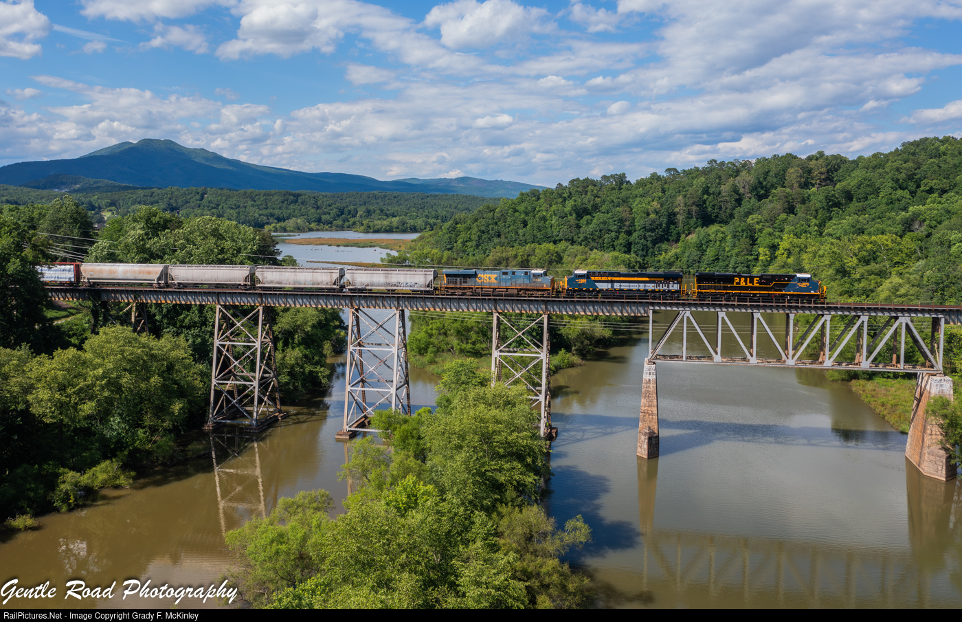 CSX's PL&E and C&O "heritage" units lead southbound M693 across the trestle over Lake James at Marion, NC.