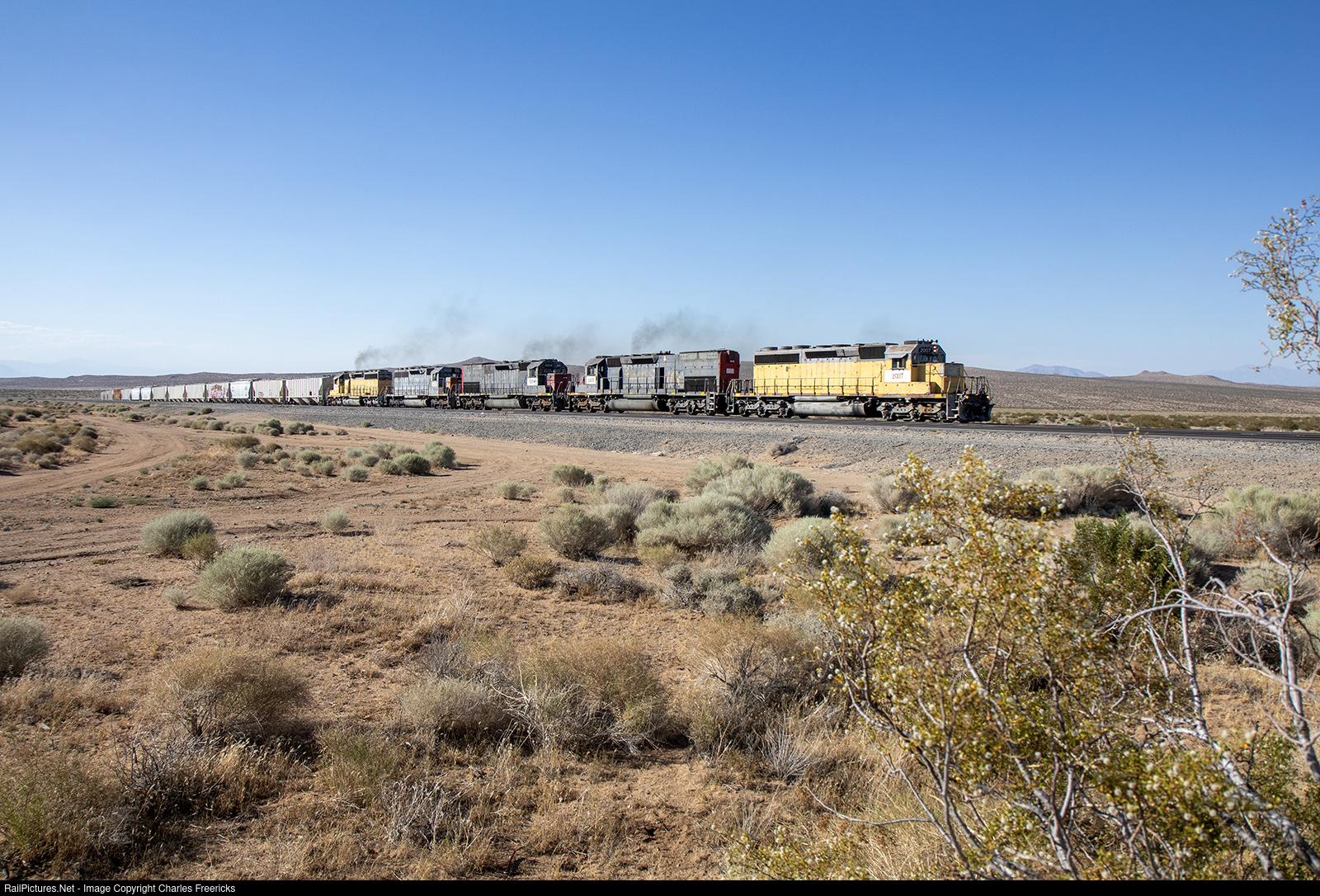 | The Trona Railway arrives at the lonely junction in Searles, where they will shove their train for the UP up the remaining stub of the SP Jawbone Branch and then grab the second half of a coal train that the UP left for them in the yard a couple hundred yards the right of frame in this shot. |
