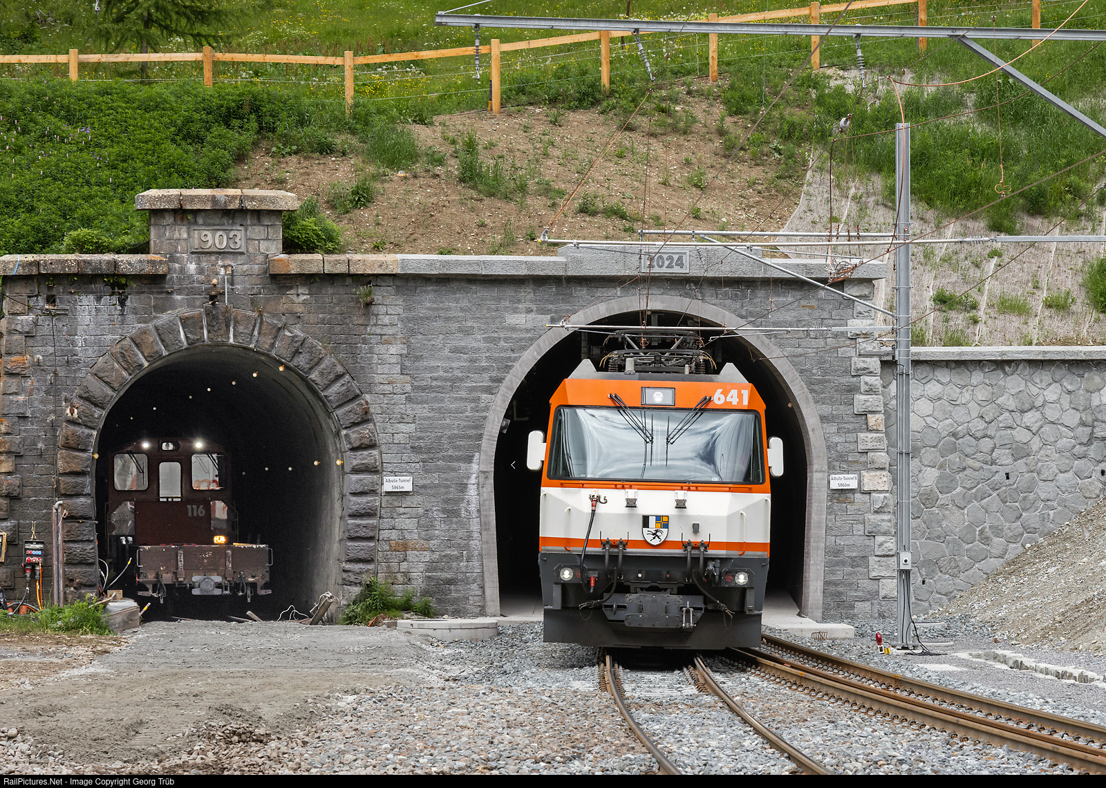 On 8 June 2024, the Rhaetian Railway's new 5860-metre Albula Tunnel II between Preda and Spinas was officially inaugurated and from 12 June, trains will run on schedule through the new tunnel, which has been under construction since 2014. The project was around 4 years behind schedule, partly due to corona and delivery delays in connection with the Ukraine conflict. Over the next two years, the old tunnel will be rebuilt into a safety tunnel, which will be connected to the new tunnel by a total of 12 cross-passages. Interregio 1133 on the IR38 line from Chur to St. Moritz with Ge 4/4 III # 641 in the Coop publicity paint scheme enters Spinas on track 1, as it has a scheduled stop here. The trains passing through use track 2. Diesel tractor Tm # 116, which has come from Preda, is parked in the old tunnel. The rails currently end directly at the tunnel portal.