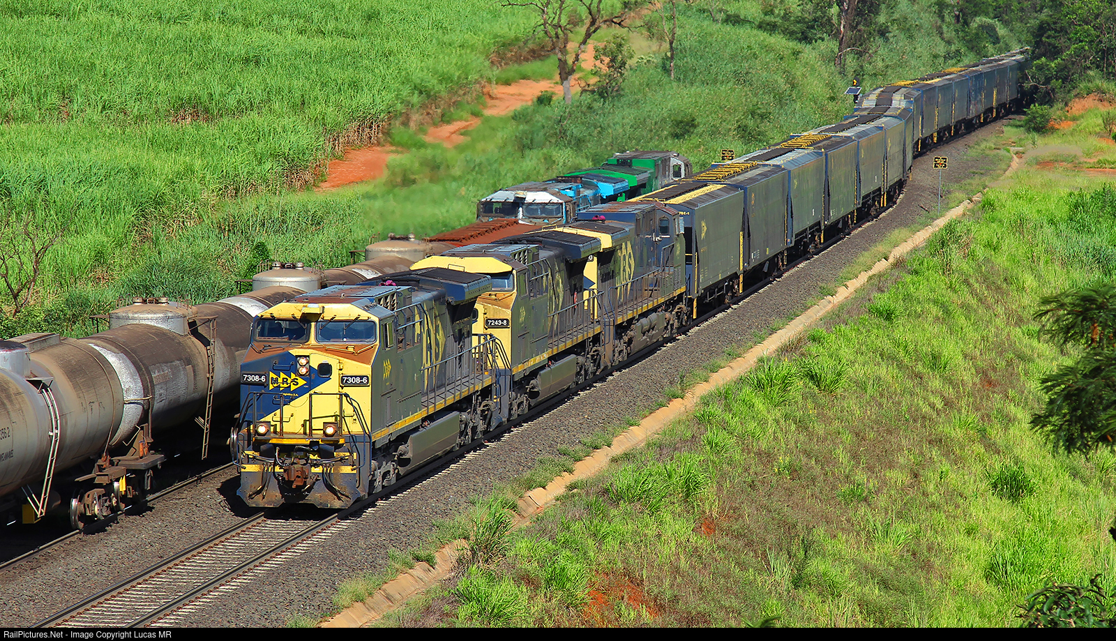 Northbound MRS train M83 led by AC44i #7308 meet southbound tanker T54 in Ouro yard.