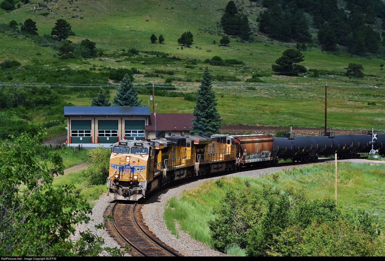 UP 7606 (ES44AC) runs past the new fire station in Coal Creek Canyon, Colorado.