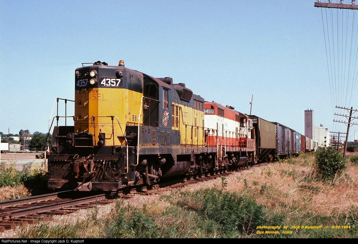 | C&NW, Chicago and North Western GP7 4357, built as QNS&L 111- GP7 4450, built as SLSF 570, with a local at Des Moines, Iowa, June 16, 1981. Jack D Kuiphoff © photo |