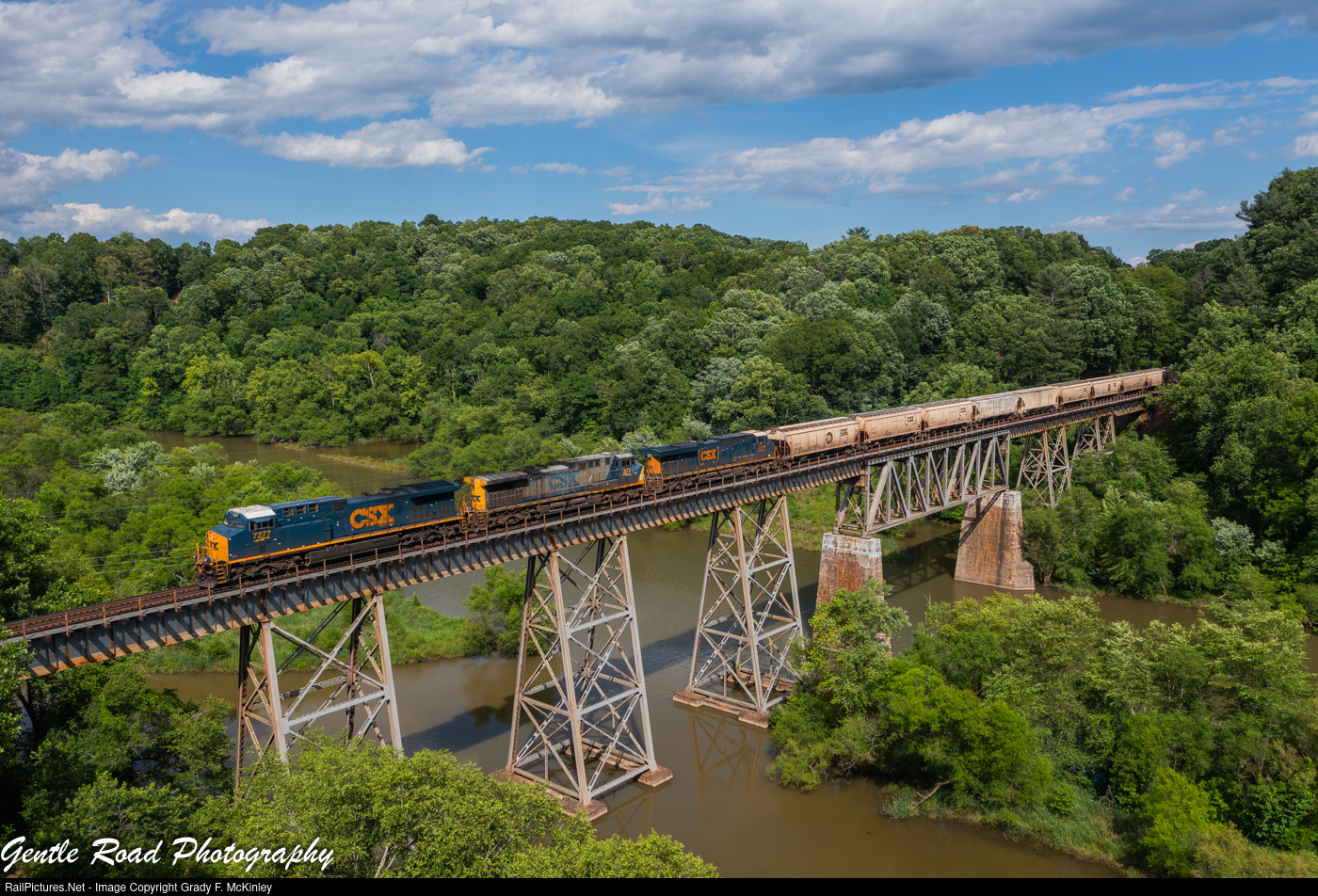 | Fresh rebuild CSX #7277 leads northbound empties for Wixom, MI across the trestle at Lake James in Marion, NC. |