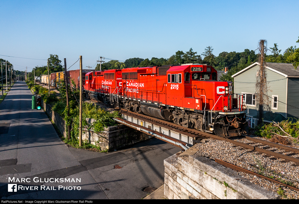 Mid-Street Running Above. On the cloudless morning of June 29, 2021, Canadian Pacific Railroad train D48 was crossing over Ellsworth Avenue in Mechanicville, New York with matched GP20C/DRS-20 2215 and 2260 leading to Saratoga Springs, New York from CP's Albany, New York Kenwood Yard. Most of the track in this area is at grade, but here the road slopes downward while the railroad remains level to allow for an underpass. The train will pass by the historic XO tower in just a moment as it travels by Mechanicville Yard.