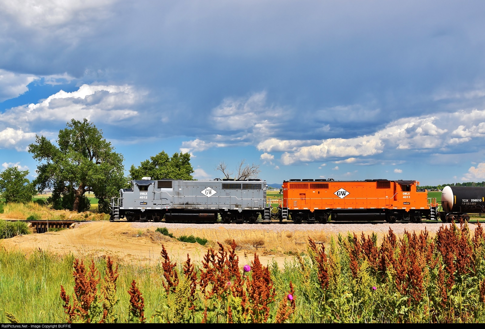 | A pair of former Canadian National GP40-2LW's now working for OmniTRAX take a cut of cars through Johnstown, Colorado.