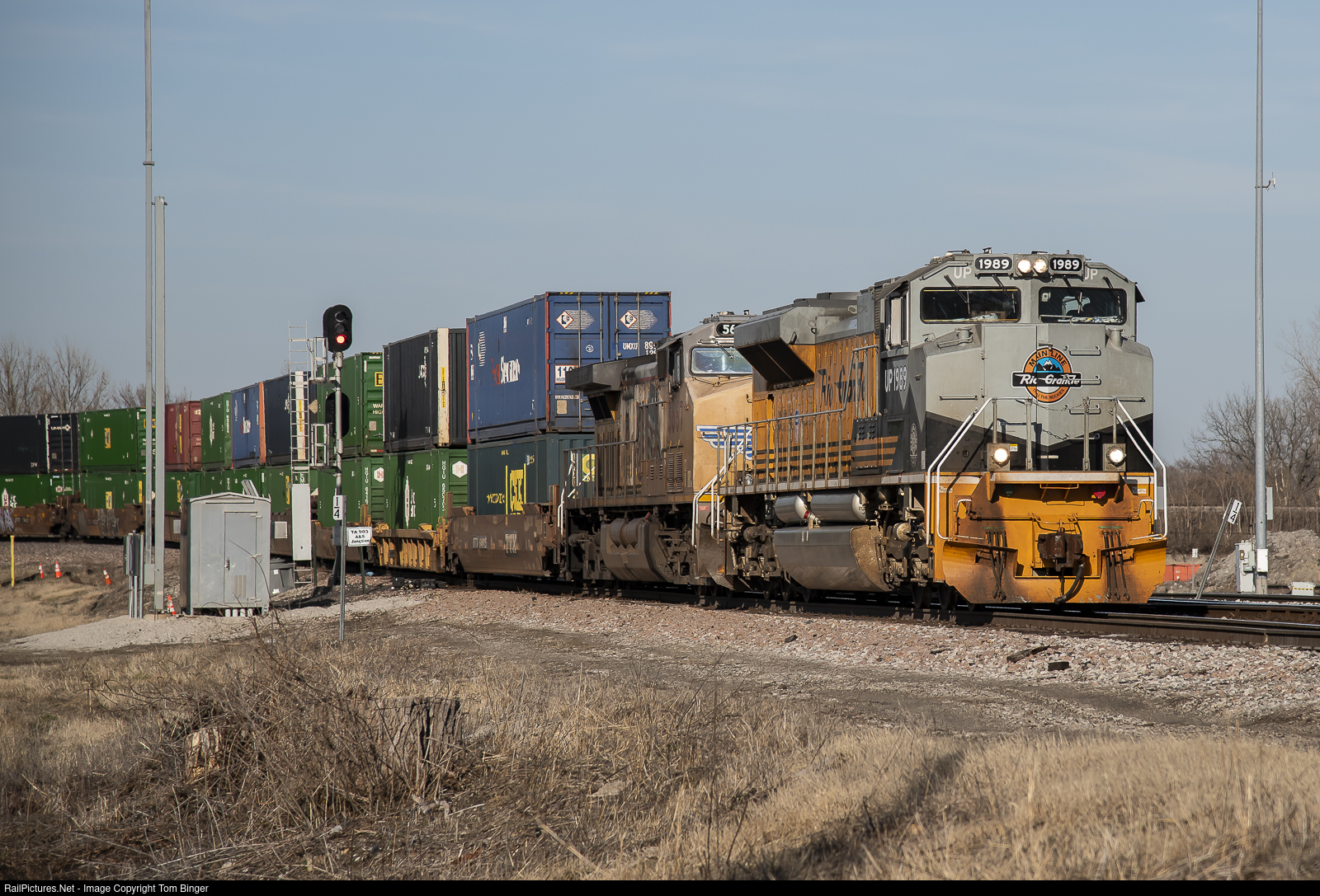 | UP 1989 brings its train off the MacArthur Bridge as it approaches the interlocking at Valley Junction and its crew change destination in Dupo, IL. |