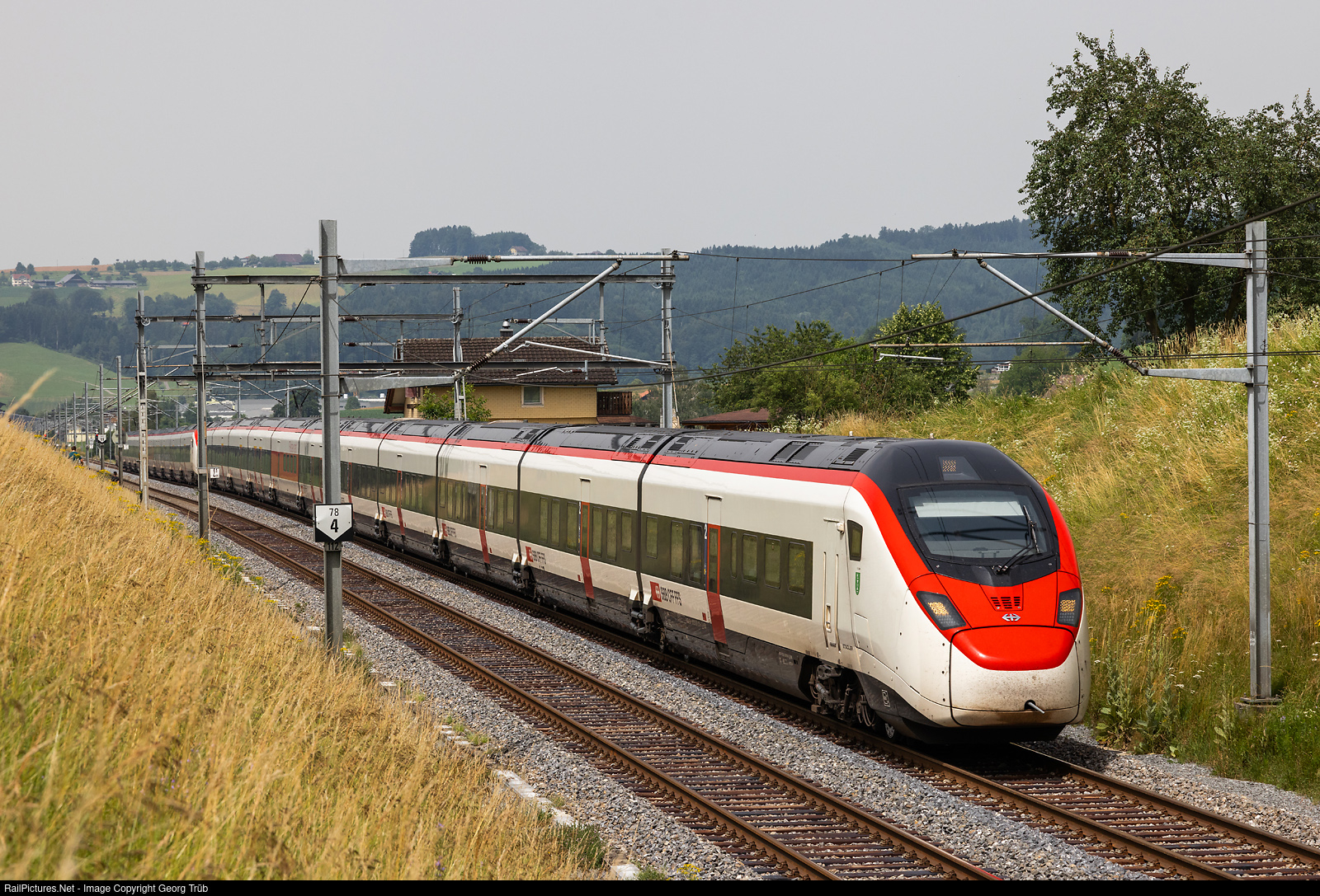 | "Giruno" highspeed trains RABe 501 # 015 "St.Gallen" and # 025 "Genève" of the SBB in multiple control are running the IC 671 of the line IC21 from Basel via Olten-Lucerne-Gotthard-Bellinzona to Lugano, between Nebikon and Wauwil. |