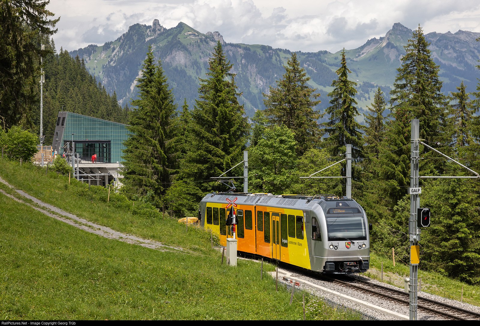 The first of three new articulated railcars has been in regular service on the Lauterbrunnen-Mürren mountain railroad (BLM) on the route between Grütschalp and Mürren for a few days now. Be 4/6 # 102 "Mönch" just left Grütschalp station for the run to Mürren.