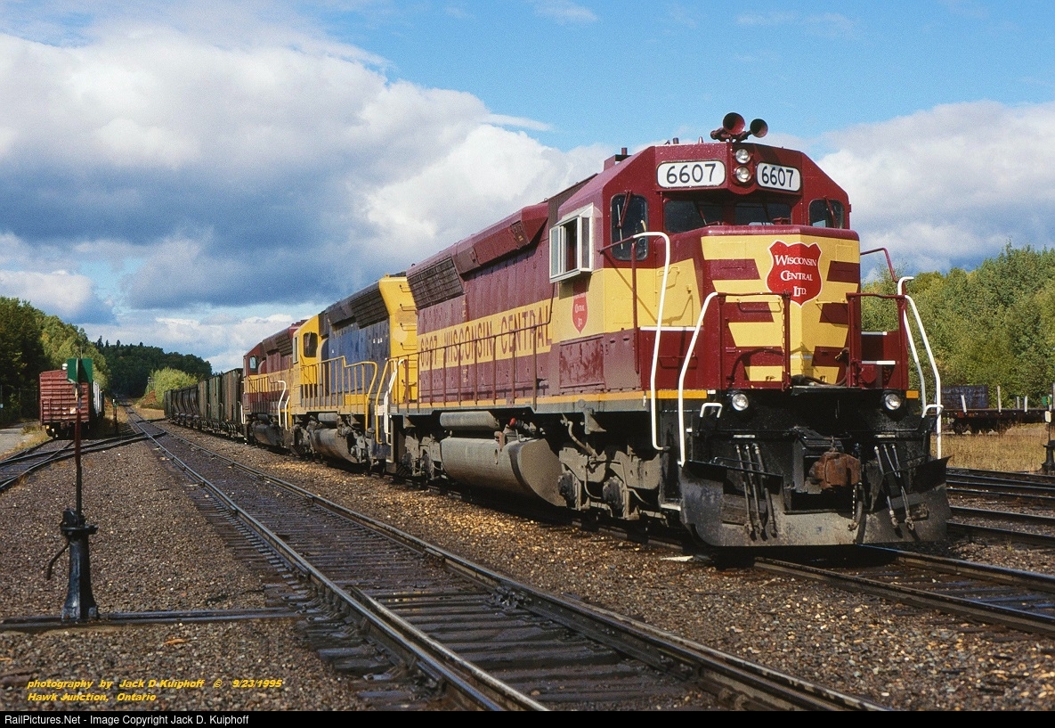 | WC, Wisconsin Central SD45's 6607-5337-6541 leads a southbound ore train on the ex-Algoma Central at Hawk Junction, Ontario. September 23, 1995. Jack D Kuiphoff © photo |