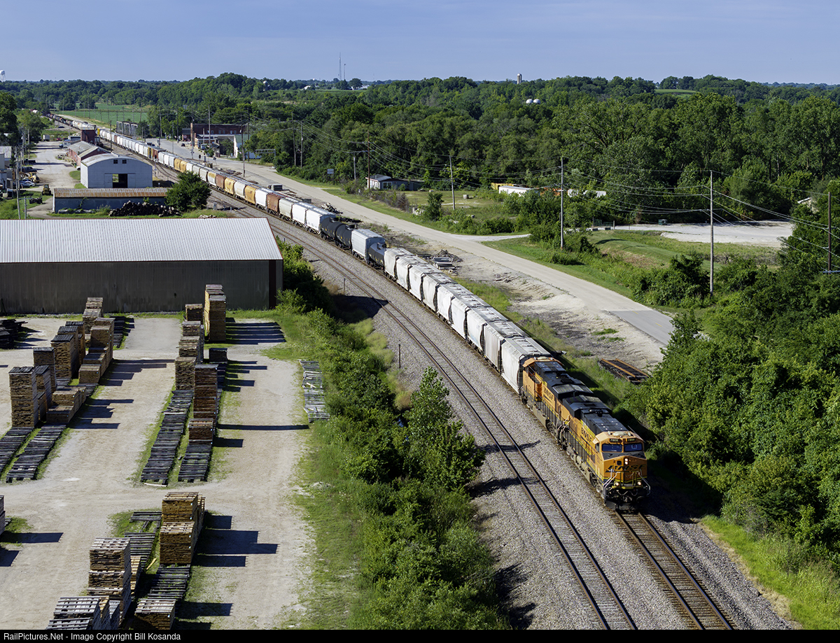 BNSF train H-MEMGAL is rolling eastbound passing Old Monroe Lumber.