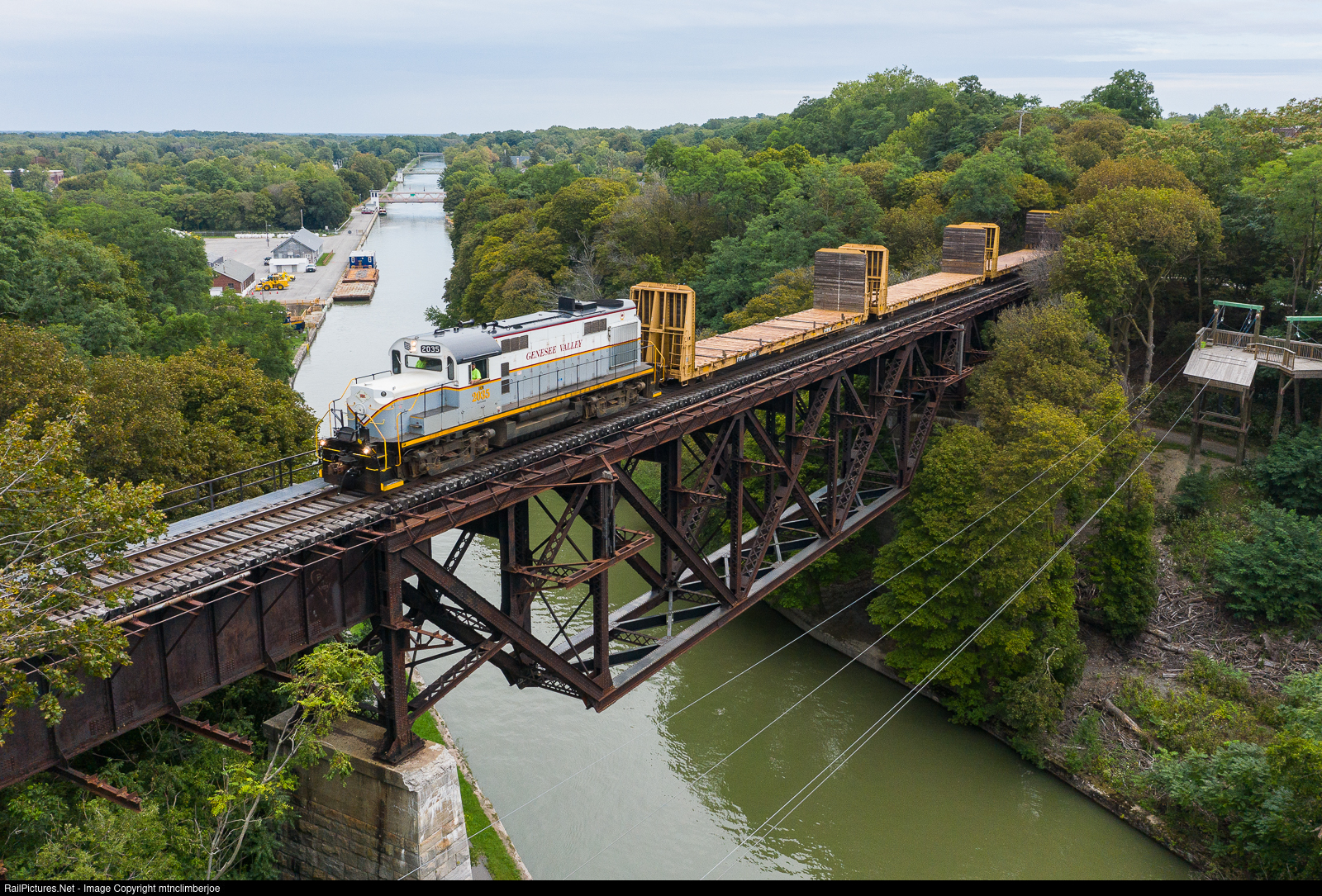| Led by an Alco RS-32, the Falls Road Railroad's Dimensional Extra move heads east through Lockport, New York to bring back the buffer cars after spotting the second transformer load in Medina. The train is making its way over the Erie Canal on what is known as the upside down bridge due to it's design as a Baltimore Deck Truss bridge with the truss span below the deck carrying the railroad. |