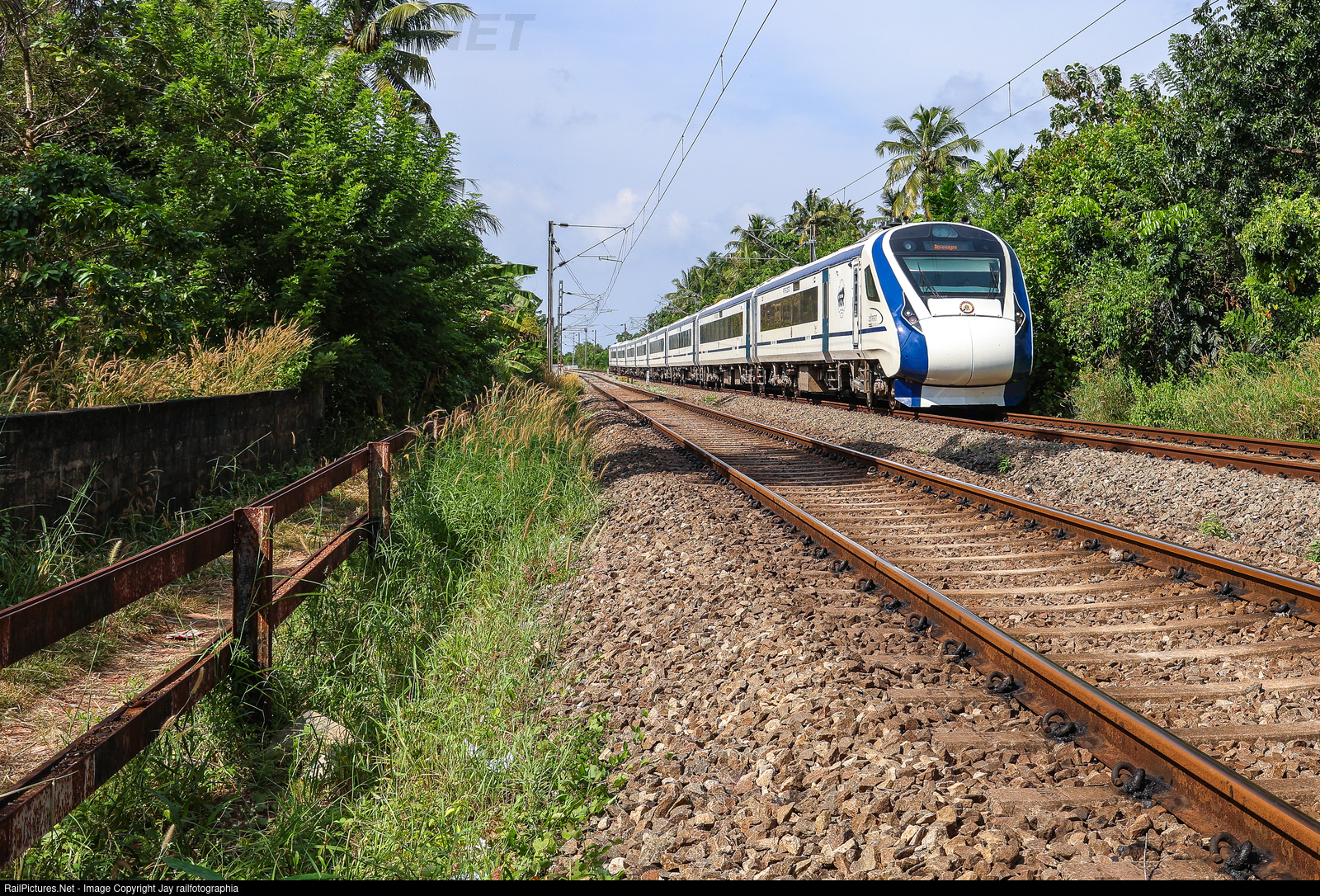 8 car Vande Bharat Express rolling down a gradient through lush green Kappil