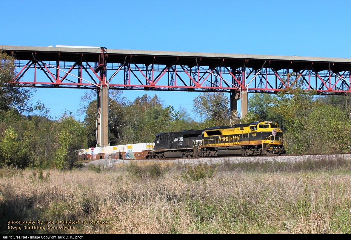 | ON THE CSX, NS, Norfolk Southern, 1069 Virginian heritage unit- and 7653, with eastbound CSX Q138, BF290 CSX Pittsburgh sub at, Smithton, Pennsylvania. October 18, 2017. Jack D Kuiphoff photo © |
