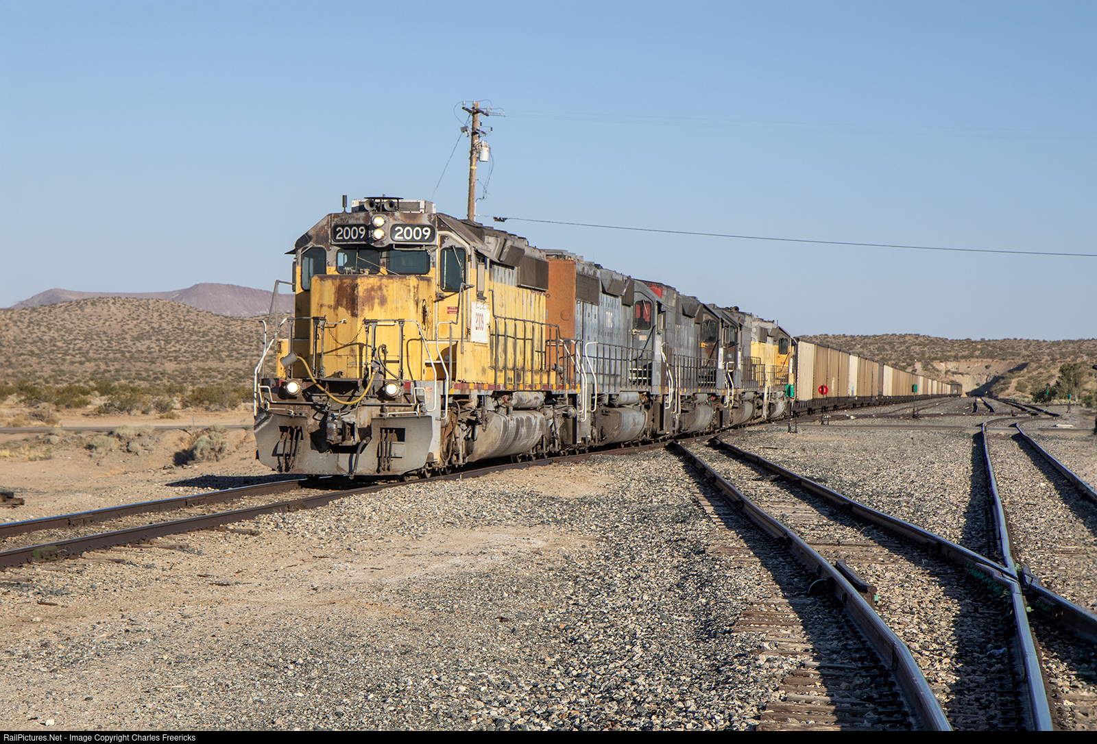 | A coal train to Trona begins its very slow creep out of Searles with nary a puff of smoke as they come out of the interchange with the UP on a downward grade. |