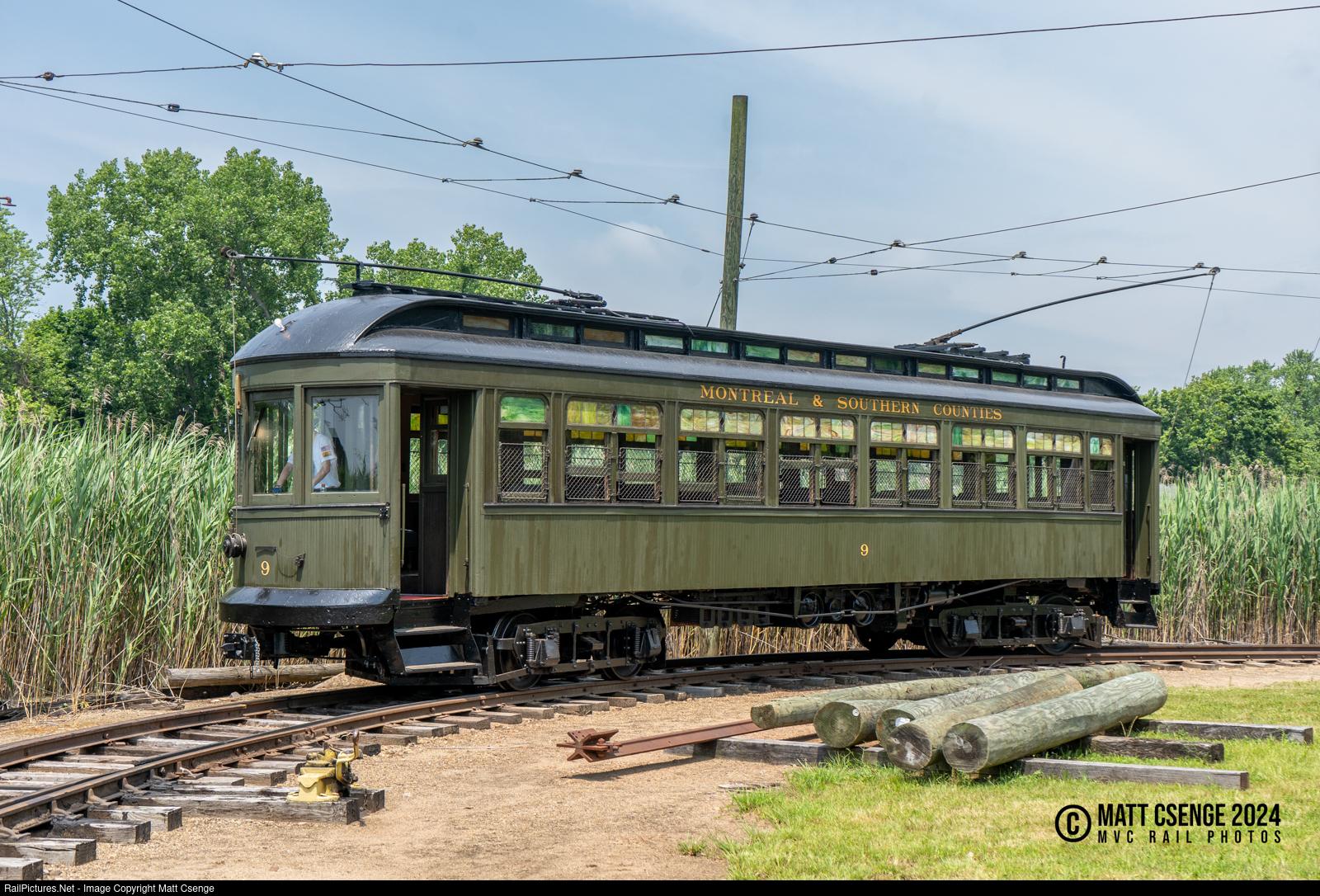 Montreal and Southern Counties interurban car no. 9 (1911) is seen curving around the loop at the Shore Line Trolley Museum, returning to the yard after the morning "Museum in Motion" parade.