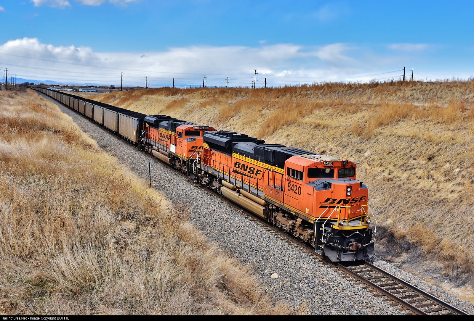 BNSF 8420 (SD70ACe) muscles a loaded coal train through the Keenesburg Cut as it heads west on the Brush Sub towards Denver, Colorado.