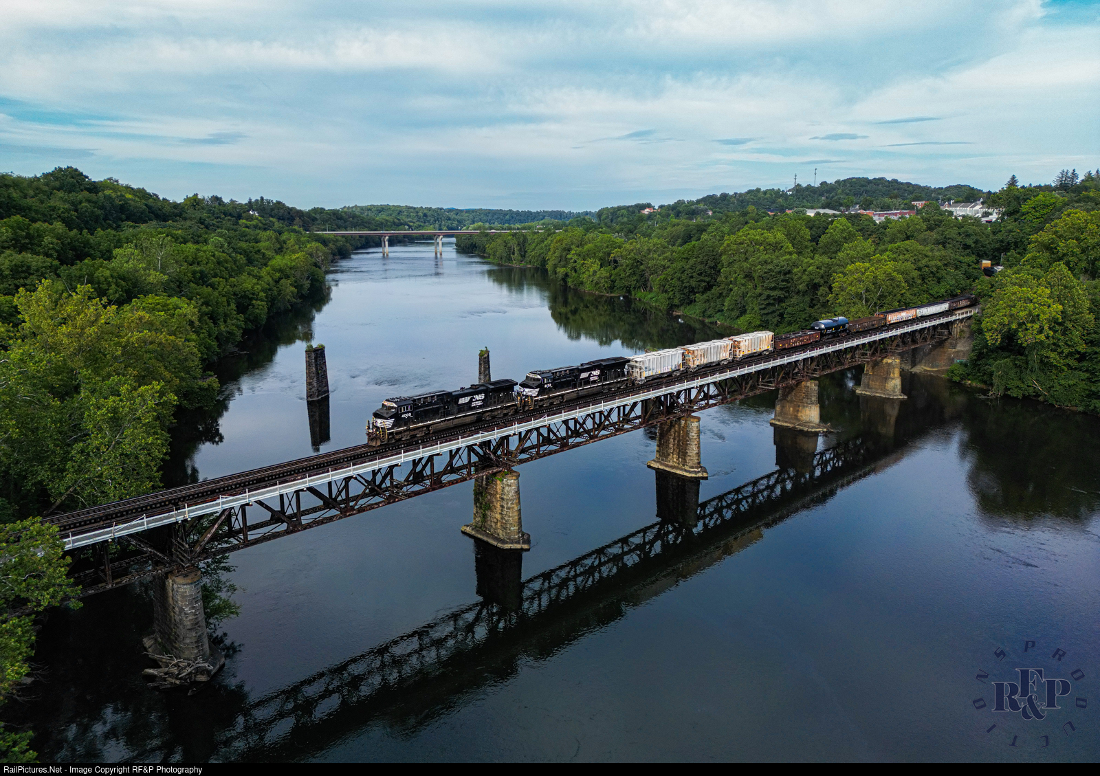 | After some delays in the NS Radford Yard, Chattanooga-bound Manifest 127 makes its way across the former Norfolk & Western Bridge over the New River.
