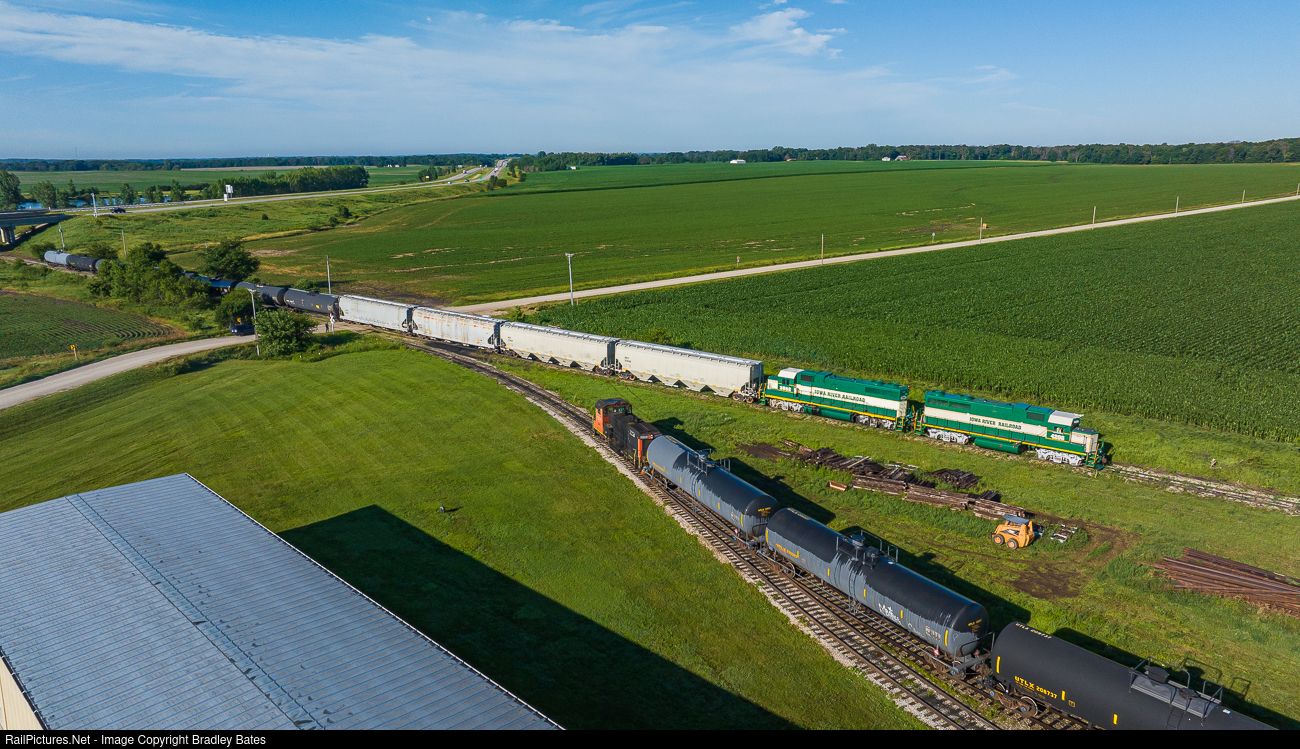 Iowa River Railroad's Ackley Turn is seen departing Pine Lake Corn Processors Plant near Cleves, IA. on their way to interchange with CN in Ackley, IA. IARR is a small short line that only operates on about 8 miles of track between the Pine Lake Corn Processors Plant just north of Steamboat Rock and Ackley, IA. they can be seen running in the morning time Monday-Friday.
