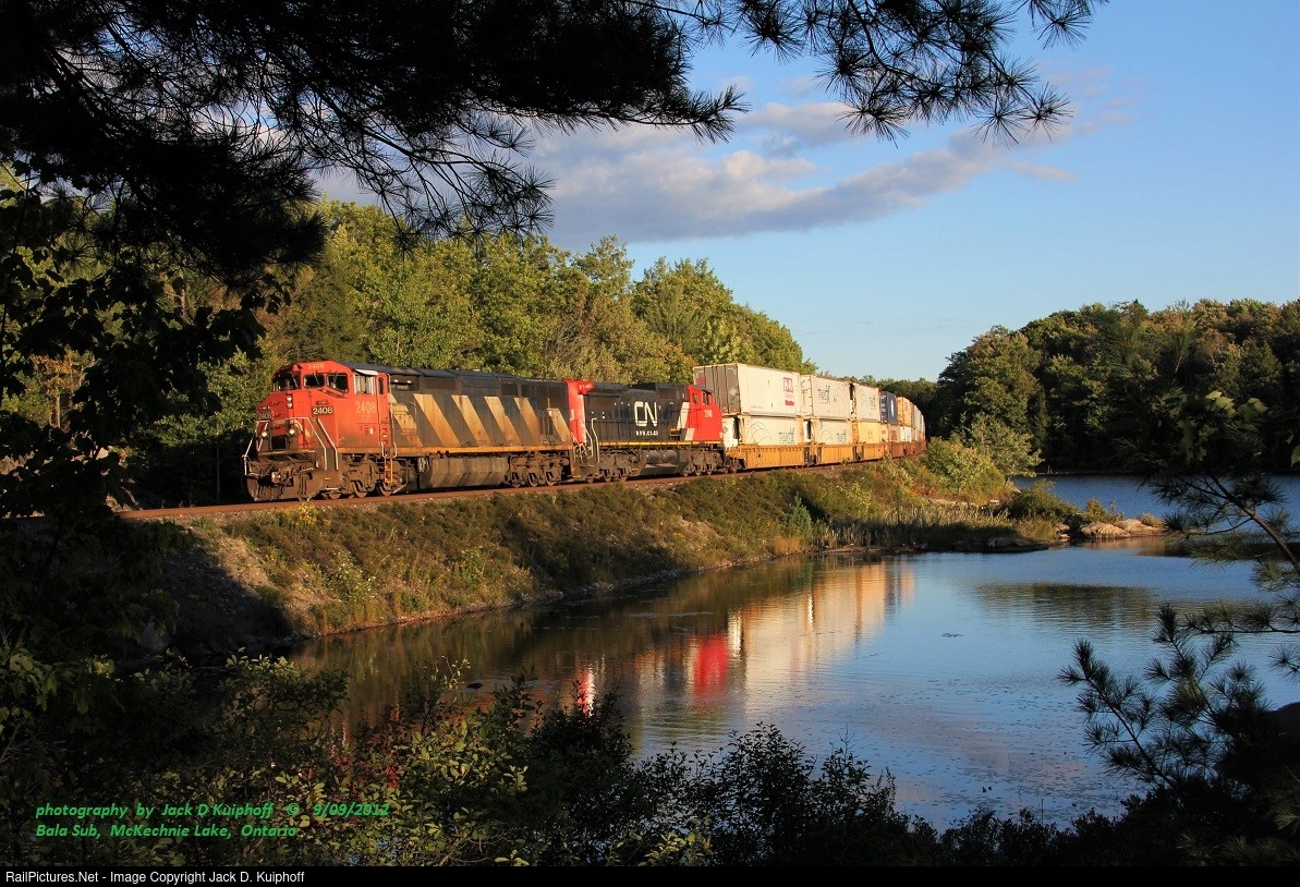 | Canadian National, CN C40-8M 2408, leads a north bound 107 at, mp134.3, CNR Bala sub, at McKechnie lake, Ontario. September 9, 2012. Jack D Kuiphoff © photo