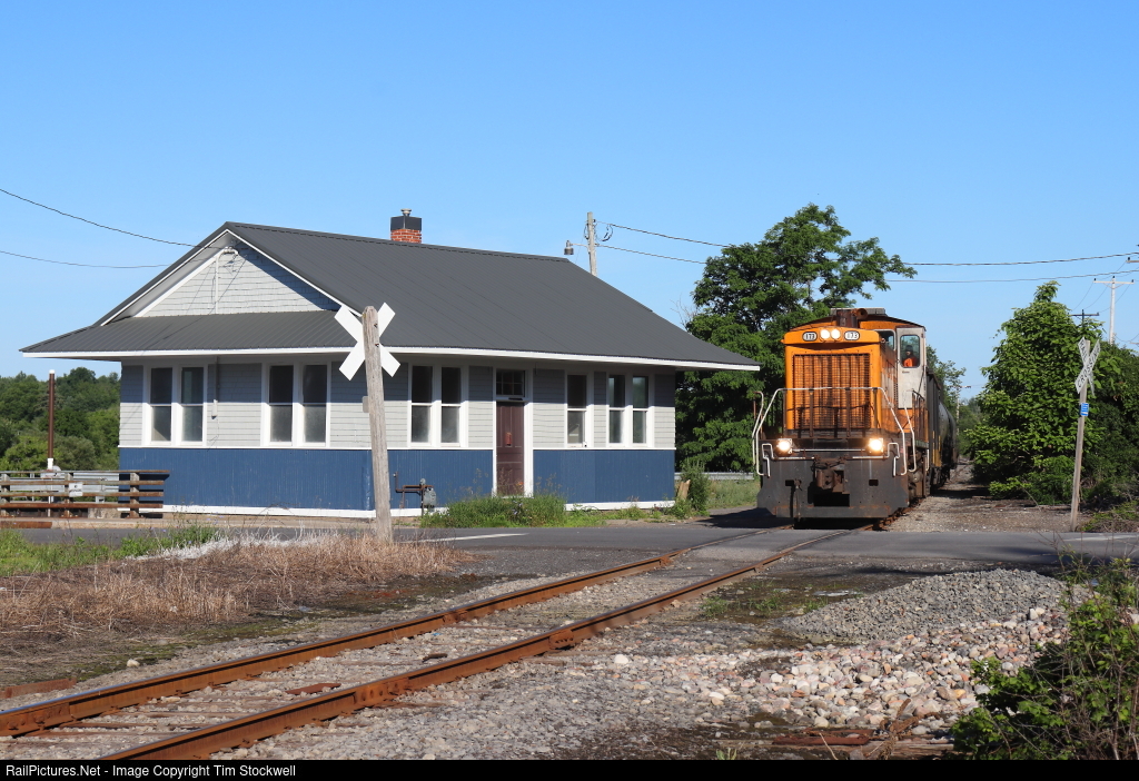 GMTX SW1500 #173 is the power on this day for Vermont Rail System's New York and Ogdensburg Railway. Here, the 173 has a spacer hopper and two, empty LPG tank cars in tow as it passes the original Norwood and St. Lawrence depot in Norfolk on its way south to the CSX interchange in Norwood. The depot was recently repainted.
