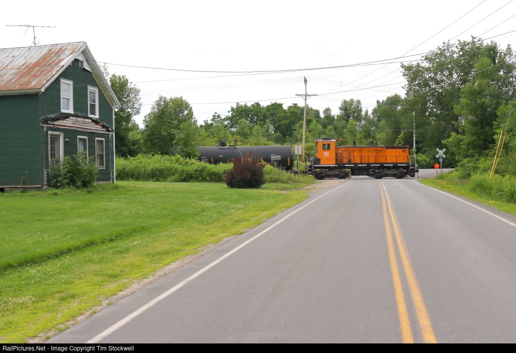 GMTX SW1500 #173 is the power on this day for Vermont Rail System's New York and Ogdensburg Railway. Here, the 173 has one tank car in tow as it crosses Wagner Road in the town of Lisbon, NY, just east of Ogdensburg. This section of the railroad between Norwood and Ogdensburg was originally the Ogdensburg and Lake Champlain Railroad and was owned and operated by the Rutland Railway from 1901 onward. This is the only surviving section of the O&LC. Everything east of Norwood disappeared with the Rutland in 1963.