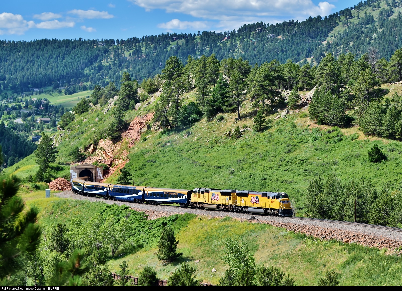 UP 4927 (SD70M) leads the Rocky Mountaineer out of Tunnel #1 in Plainview, Colorado.