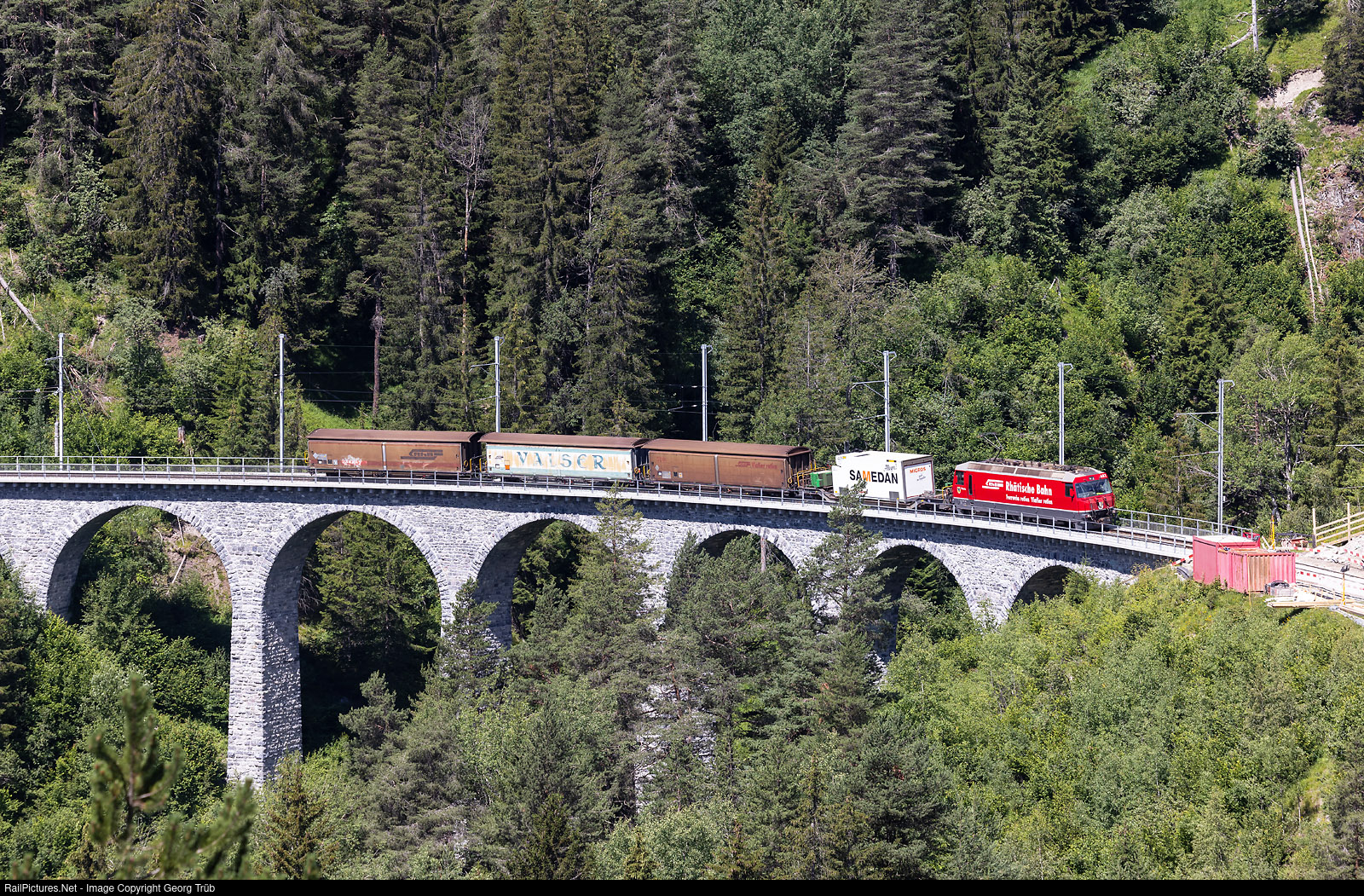 Ge 4/4 III # 651 of the Rhaetian Railway is crossing the Schmittentobel viaduct between Alvaneu and Filisur with freight train 5129 from Chur freight yard to Samedan.