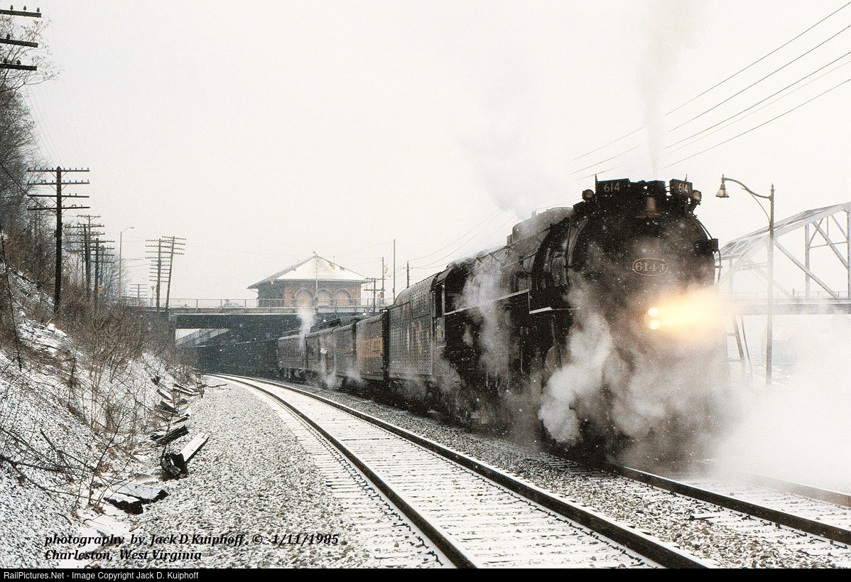 | C&O 4-8-4 Greenbrier 614T with fifty loaded coal hoppers on a run from Huntington, to Hinton WV. It was on steam powered testing for one month in January 1985. 614T has stopped at Charleston, West Virginia. station to pick up a road foremen. January 11, 1985. Jack D Kuiphoff photo © |