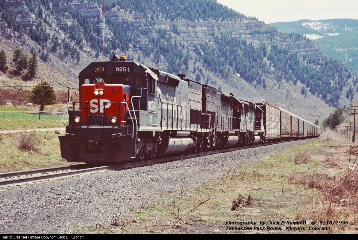 Southern Pacific, SP SD45T-2 9254, with a westbound rack train on the D&RGW's Tennessee Pass Route, Minturn, Colorado. May 10, 1996. Jack D Kuiphoff © photo