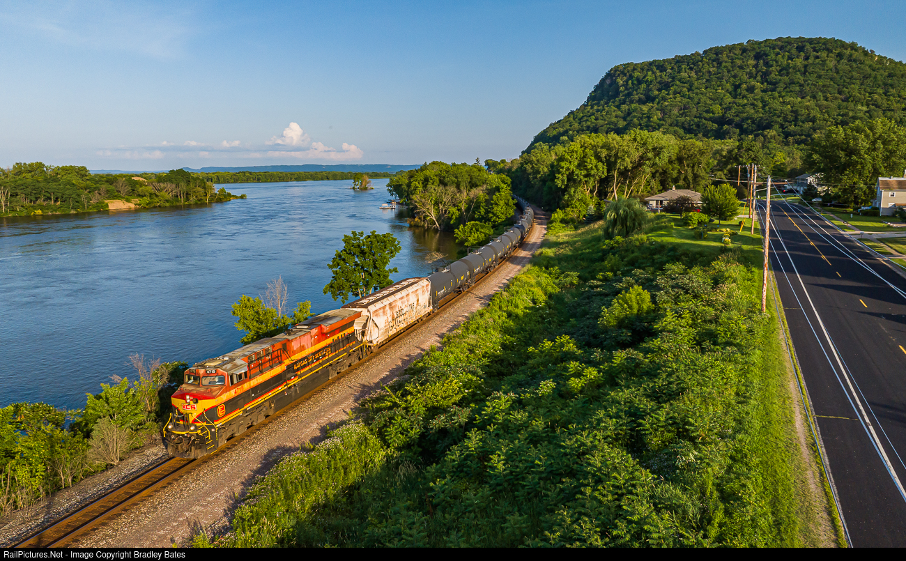 CPKC Train 541 heads westbound along the Mississippi River through Dakota, MN. on a beautiful summer evening.