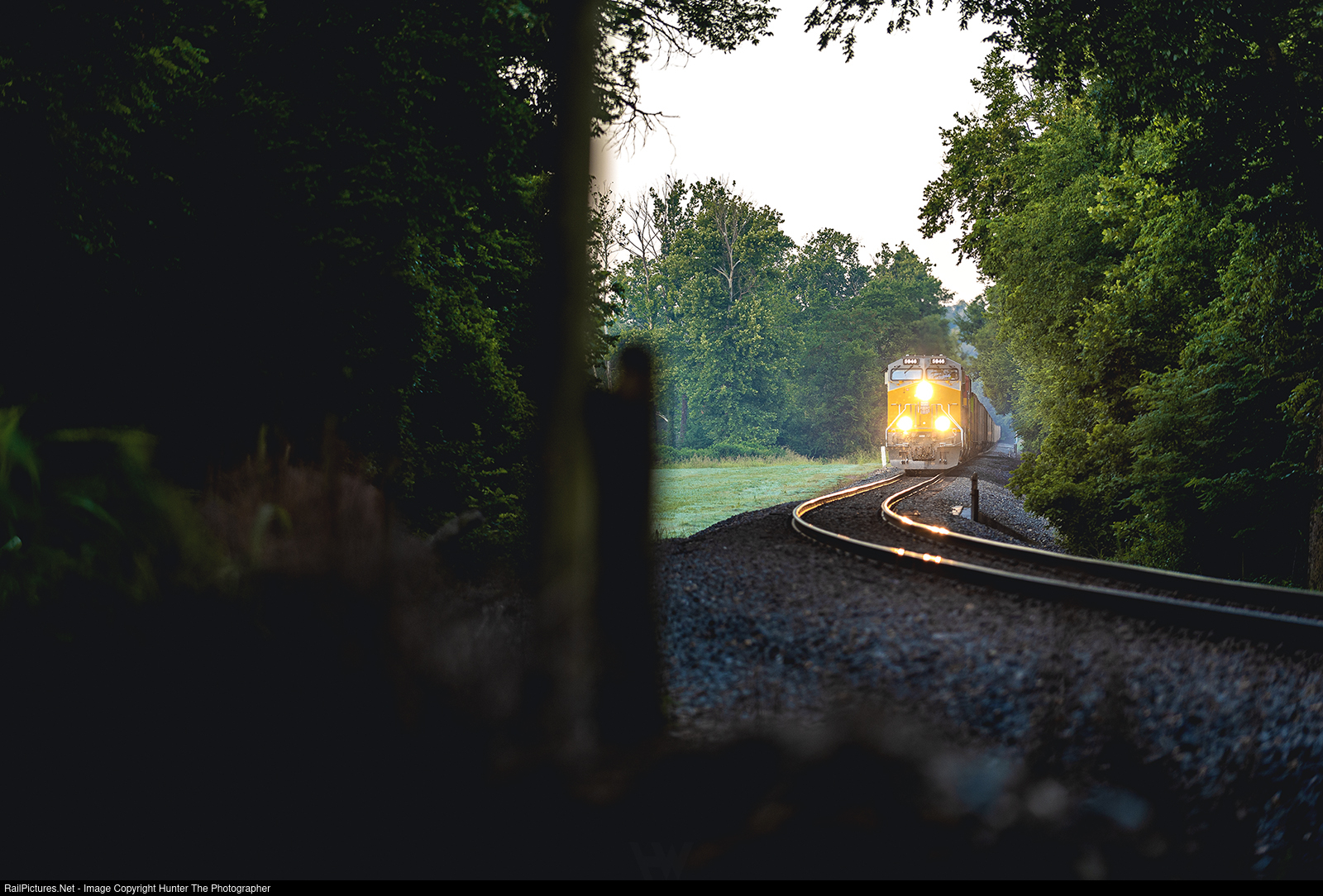Dawn Around The Bend | A northbound train of empty coal hoppers comes to a stop on the CPKC mainline just south of Sulphur Springs, AR as it waits to enter the siding at Noel on the cool morning of Sunday, July 7, 2024. After a bit, the northbound coal train would meet two southbound trains in beautiful morning light.
