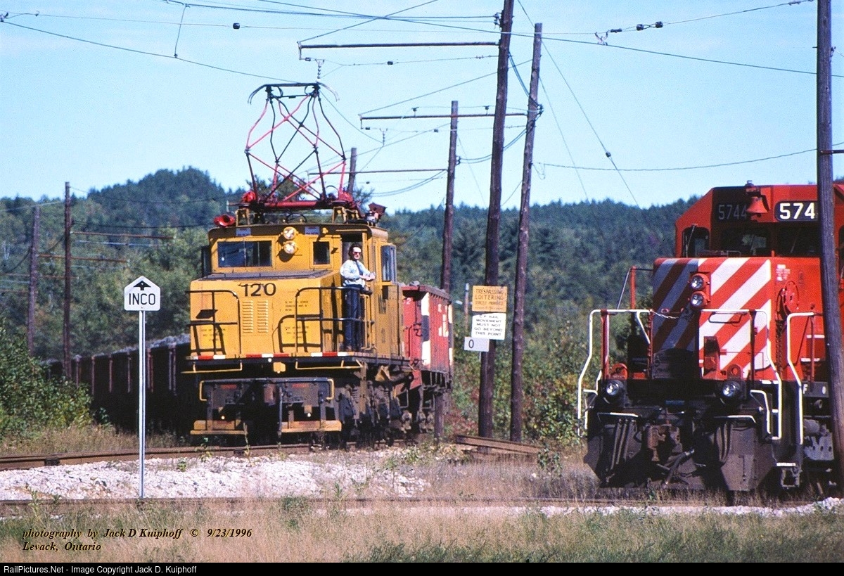 | INCO, 100 ton GE, 120, with a string of CPR jennies loaded with nickel ore for the INCO smelter at Sudbury. INCO is about to interchange with the CP at Levack, Ontario for the short trip east, and will be handed back to the INCO. INCO, and the electrics are now only a memory, as it is now owned by VALE. September 23, 1996. Jack D Kuiphoff © photo |