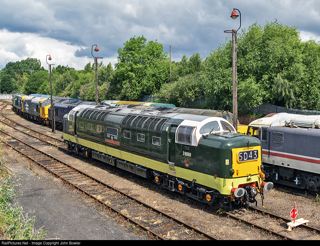| What a pleasant surprise to see BR Class 55 'Deltic' D9000 (55022) 'Royal Scots Grey', in it's original British Railway Two Tone Green Livery, on shed at the Barrow Hill Roundhouse. |